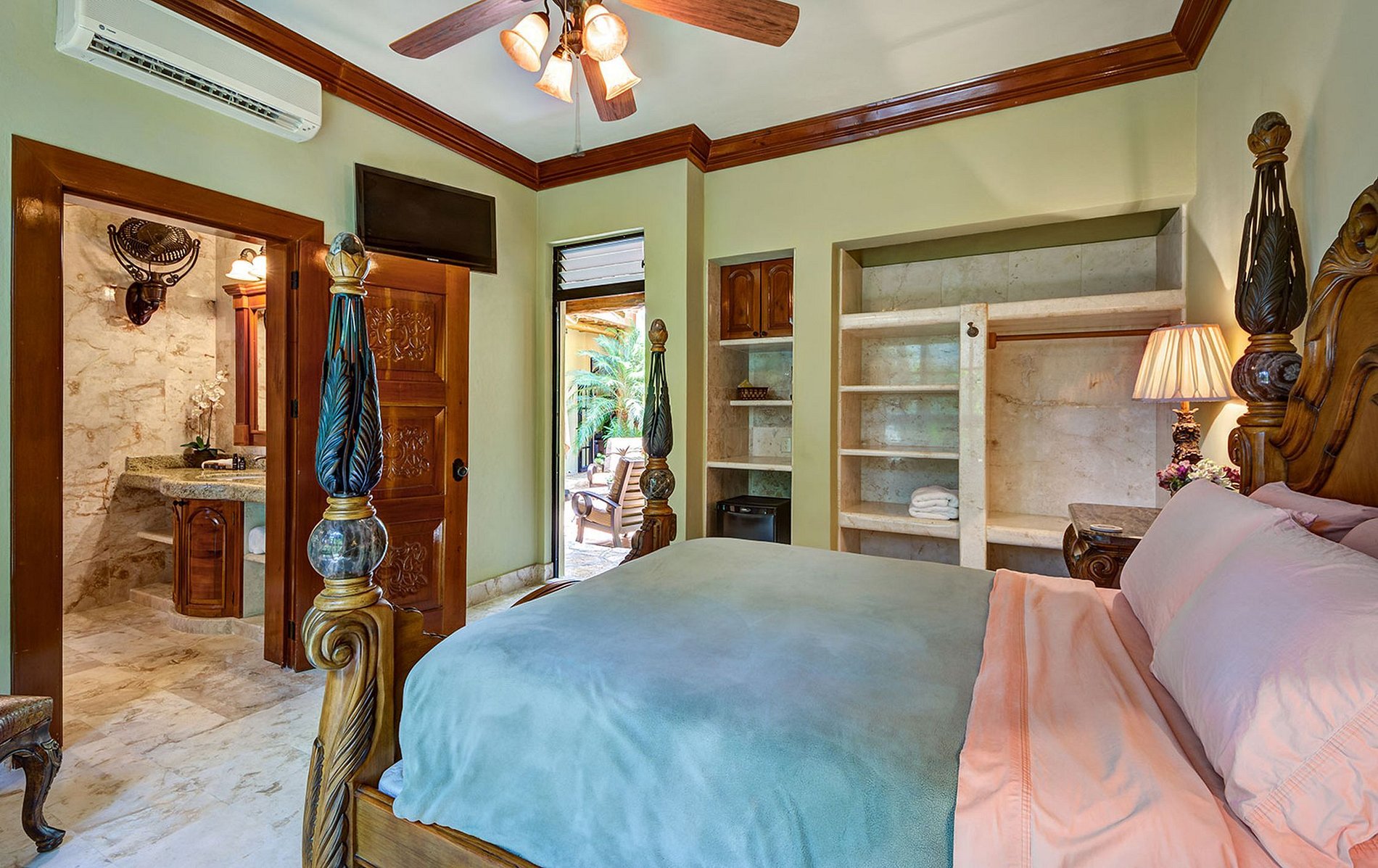 Queen size bed, Air conditioning, Ceiling fan, Ensuite bathroom with shower, Flat screen TV, Garden view, Mini fridge, Private entrance, Safety box, Telephone, Toiletries, Wifi access, Window screen