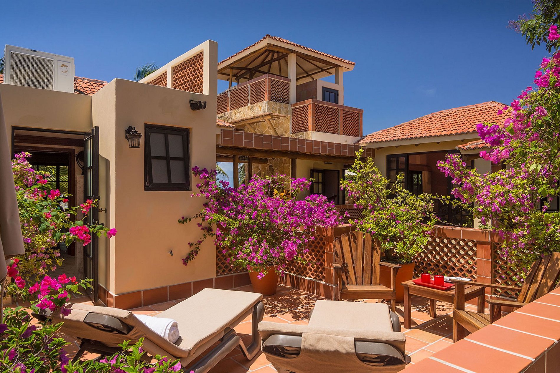 The villa offers 3 ensuite bedrooms in total, with three sharing the stunning views across the sea. Downstairs you will find a fully equipped kitchen, best applied by the private Maya Luxe chef service, to create delicious meals throughout the day. The bustling courtyard provides the center piece of the house while the watchtower makes for an experience like no other within Playa del Carmen. Make sure to head up there as the sun sets and the sky turns a magical pink.