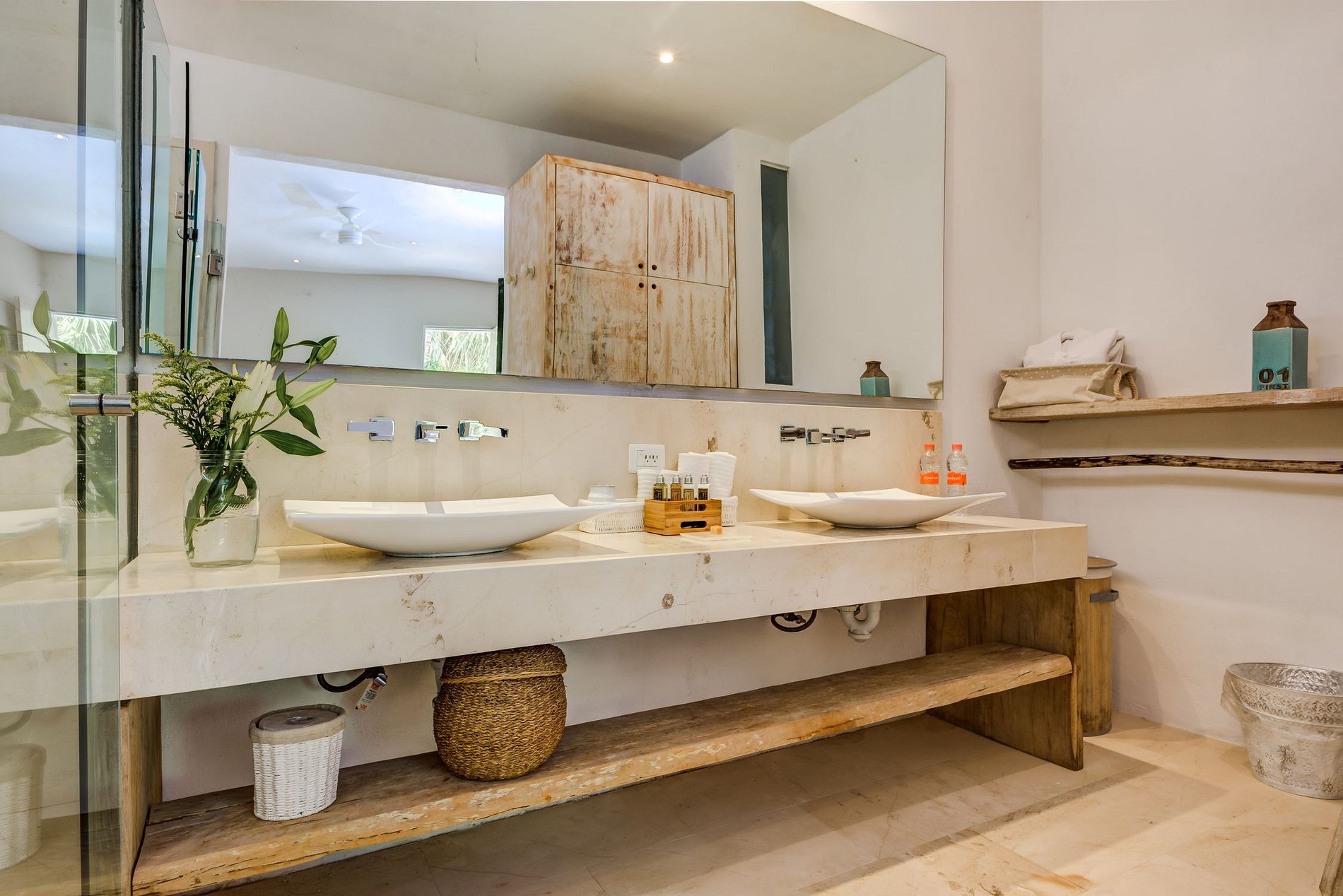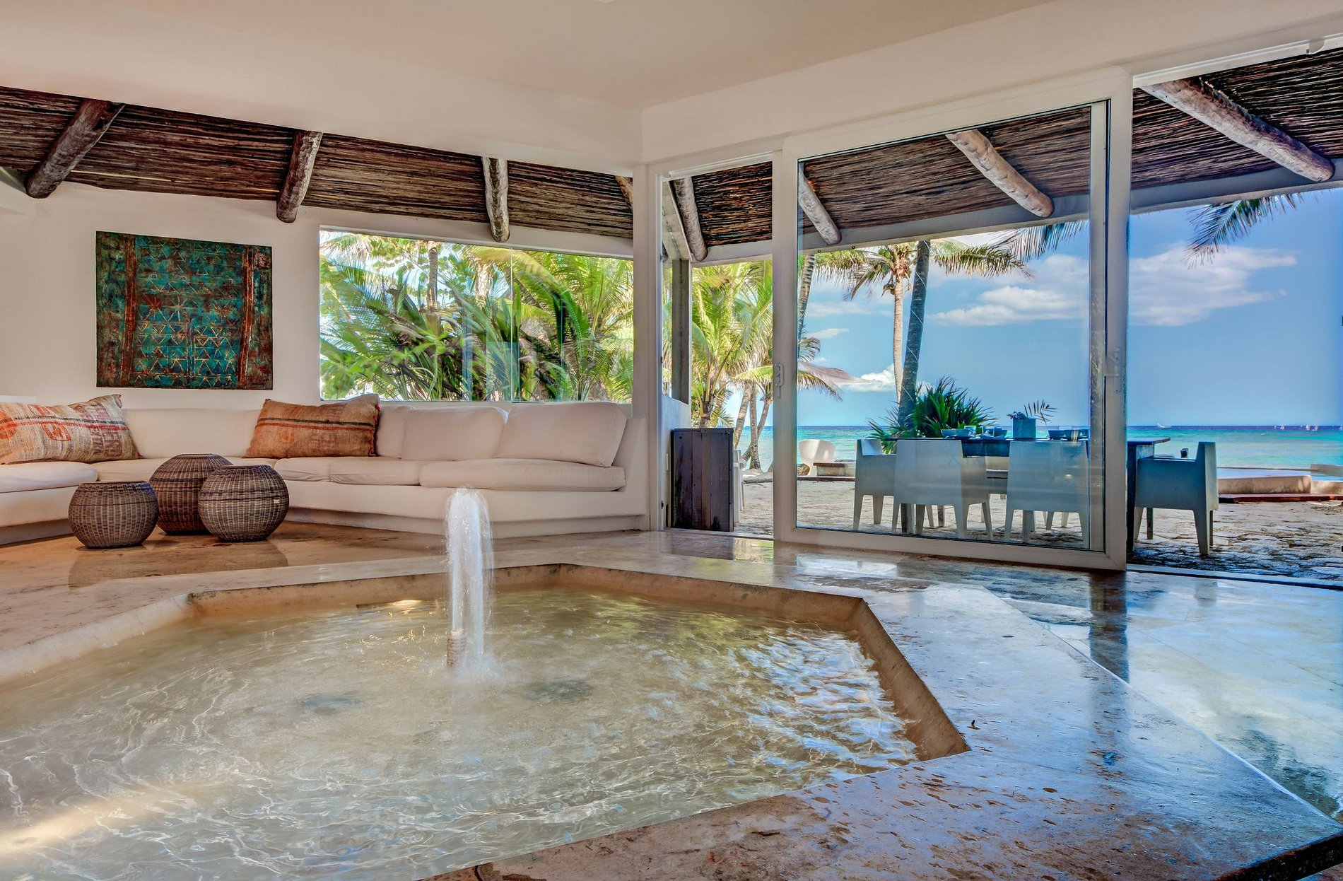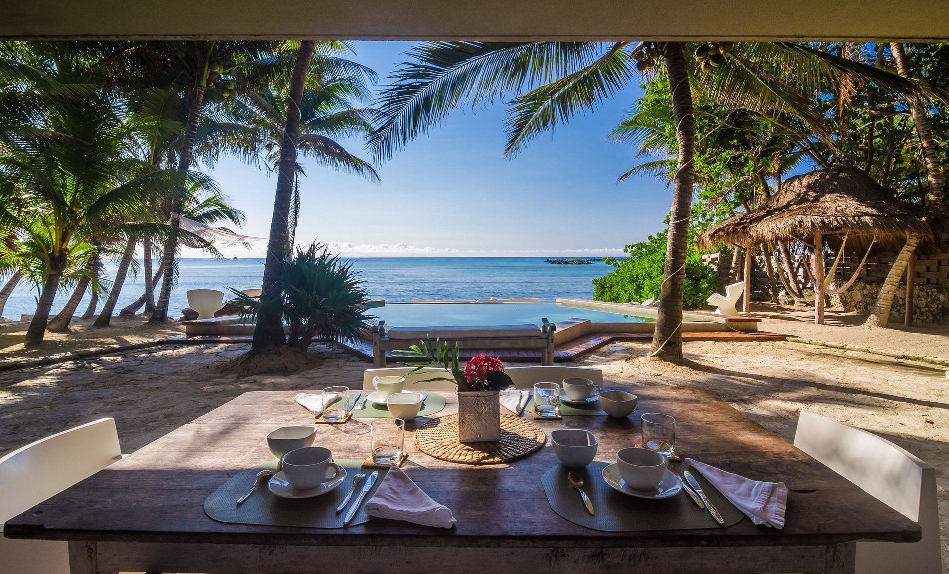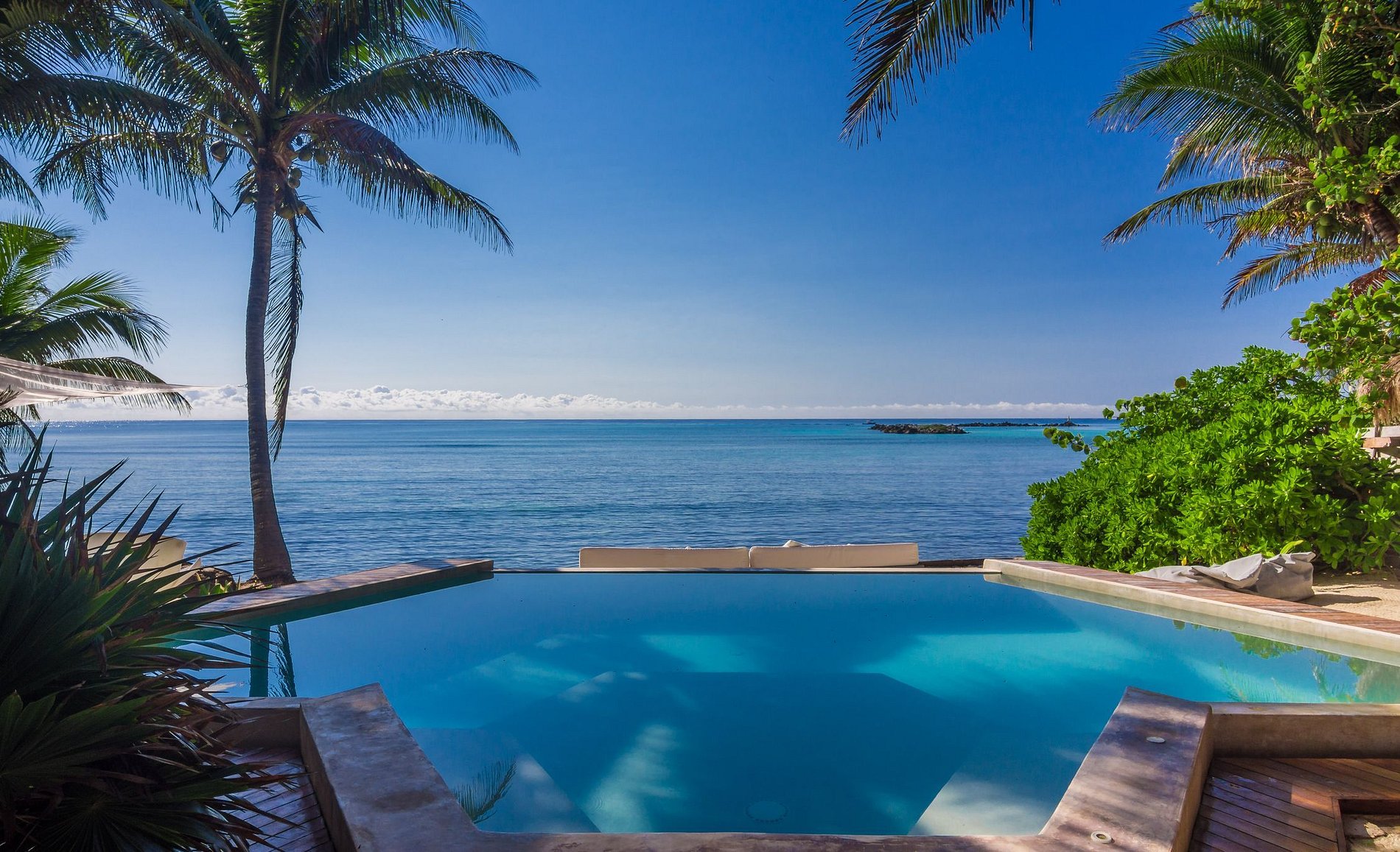 Think eco chic when you are imagining your stay in this house. The newly added solar panels on the roof make it self-sustainable, while the two brand-new bedrooms overlook the lush greenery of the garden. A private open-air shower on the beach will allow you to enjoy the tropical breeze whilst admiring the ocean. The secluded beach gives you the choice of swimming in the natural waters or the three-way infinity pool while enjoying the breeze and the calm of Puerto Aventuras. After sunset, wash off the salt water under the stars in house's ‘moon shower’, located in one of the brand-new bedrooms.