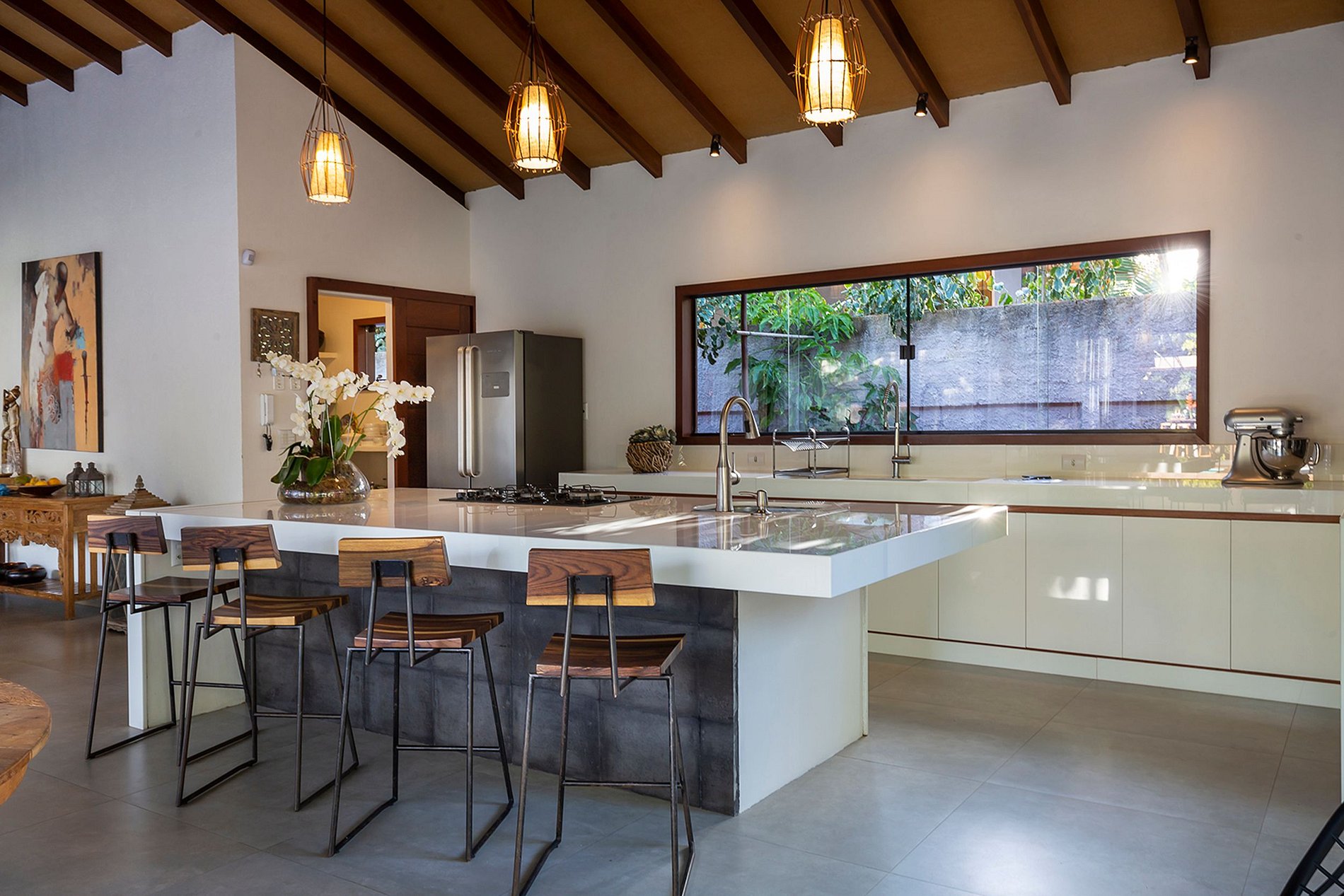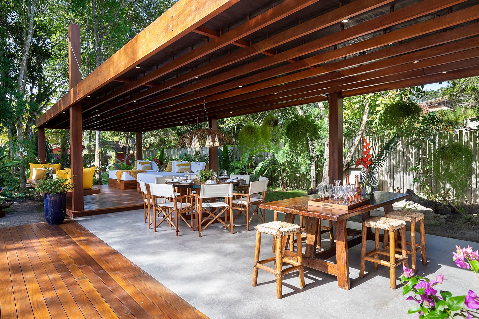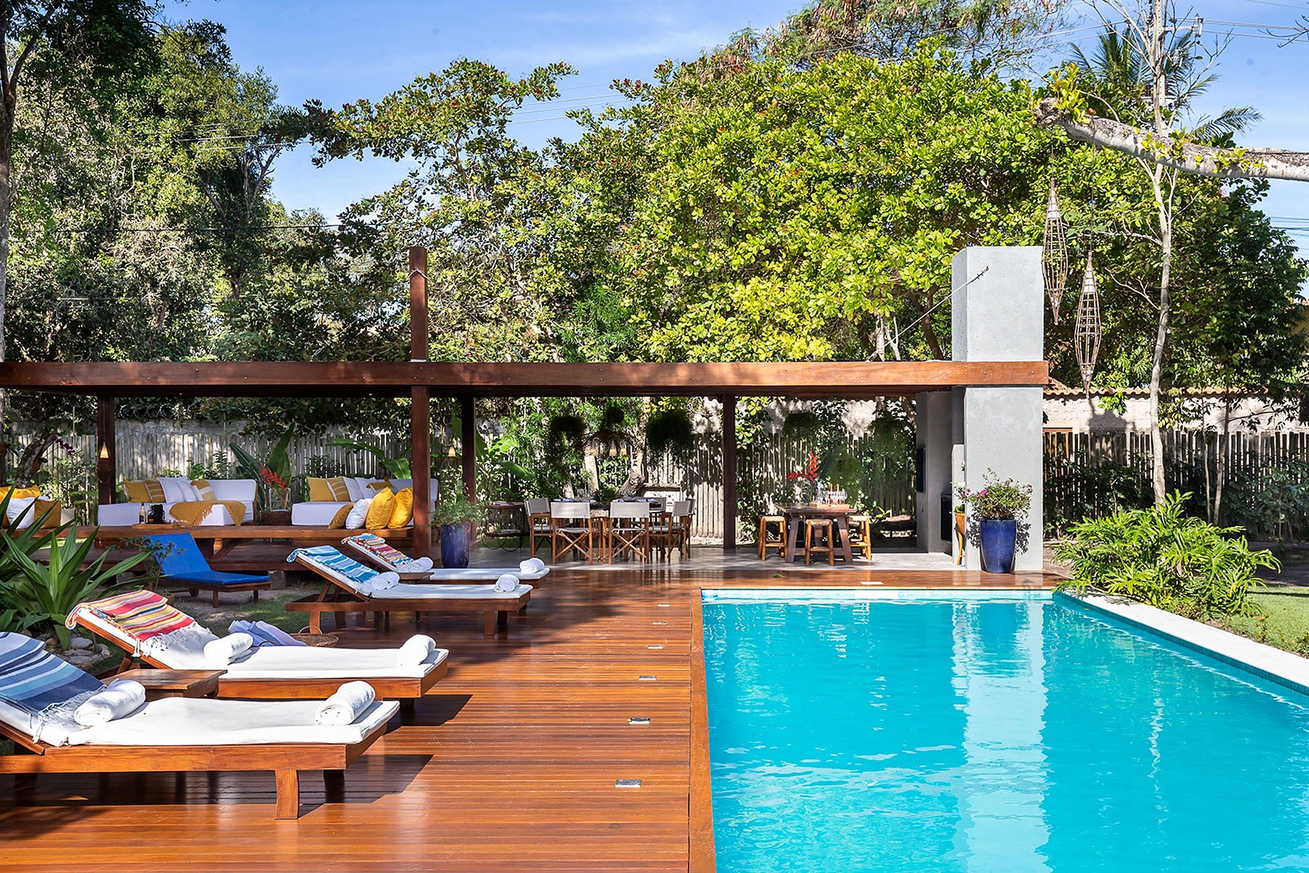 There are 2000 m² of land with a lush tropical garden, wonderfully well cared for. There are 375 m² of built area. It has 4 suites that are separated into two independent areas, and the social area is the central building. However, the biggest attraction is the large swimming pool. And a great gourmet area with barbecue and beer garden.