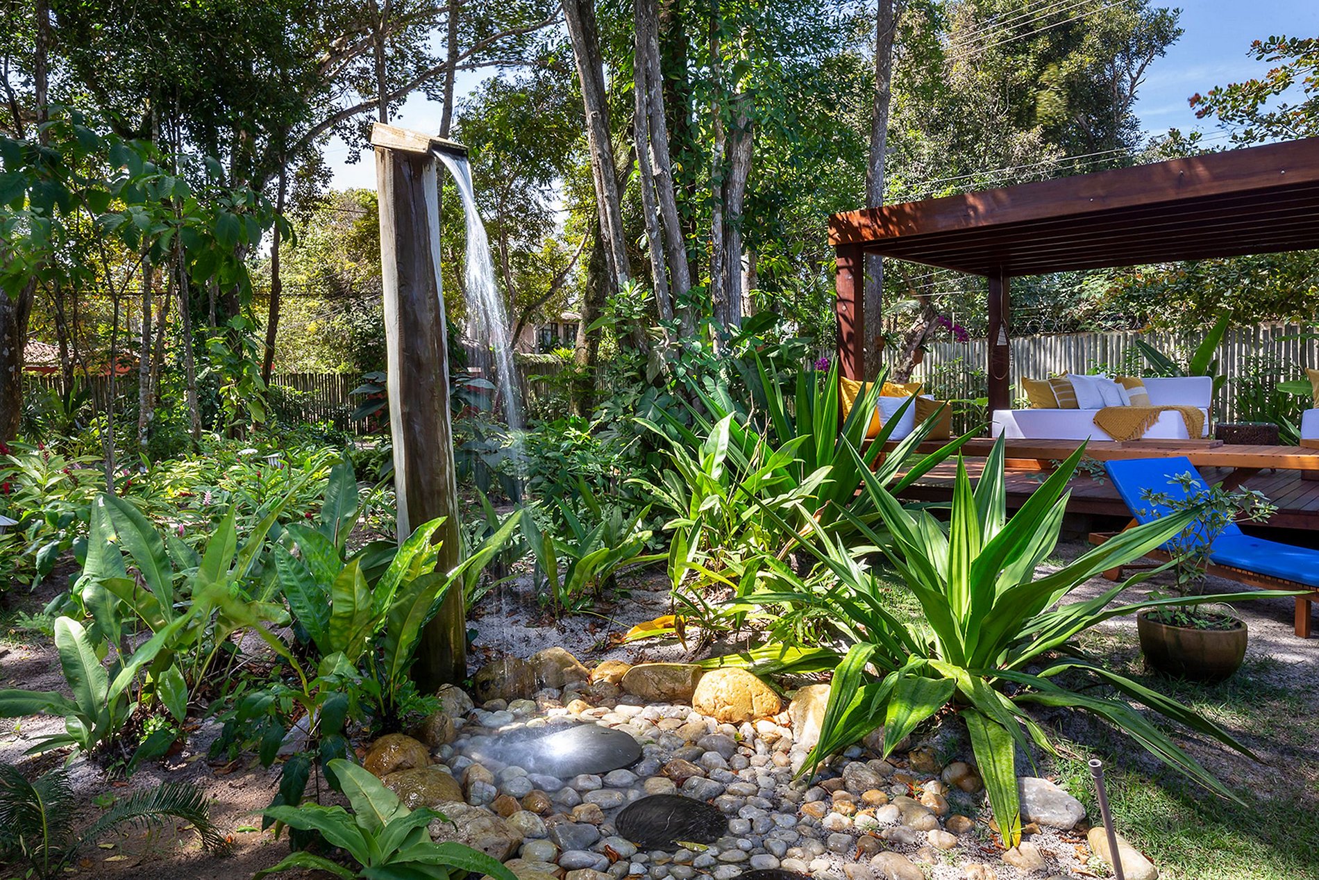 The house has a waterfall shower in the middle of the private forest garden. It has an 8,000 liter water reservoir. Bluetooth 5.1 built-in sound in the social area.