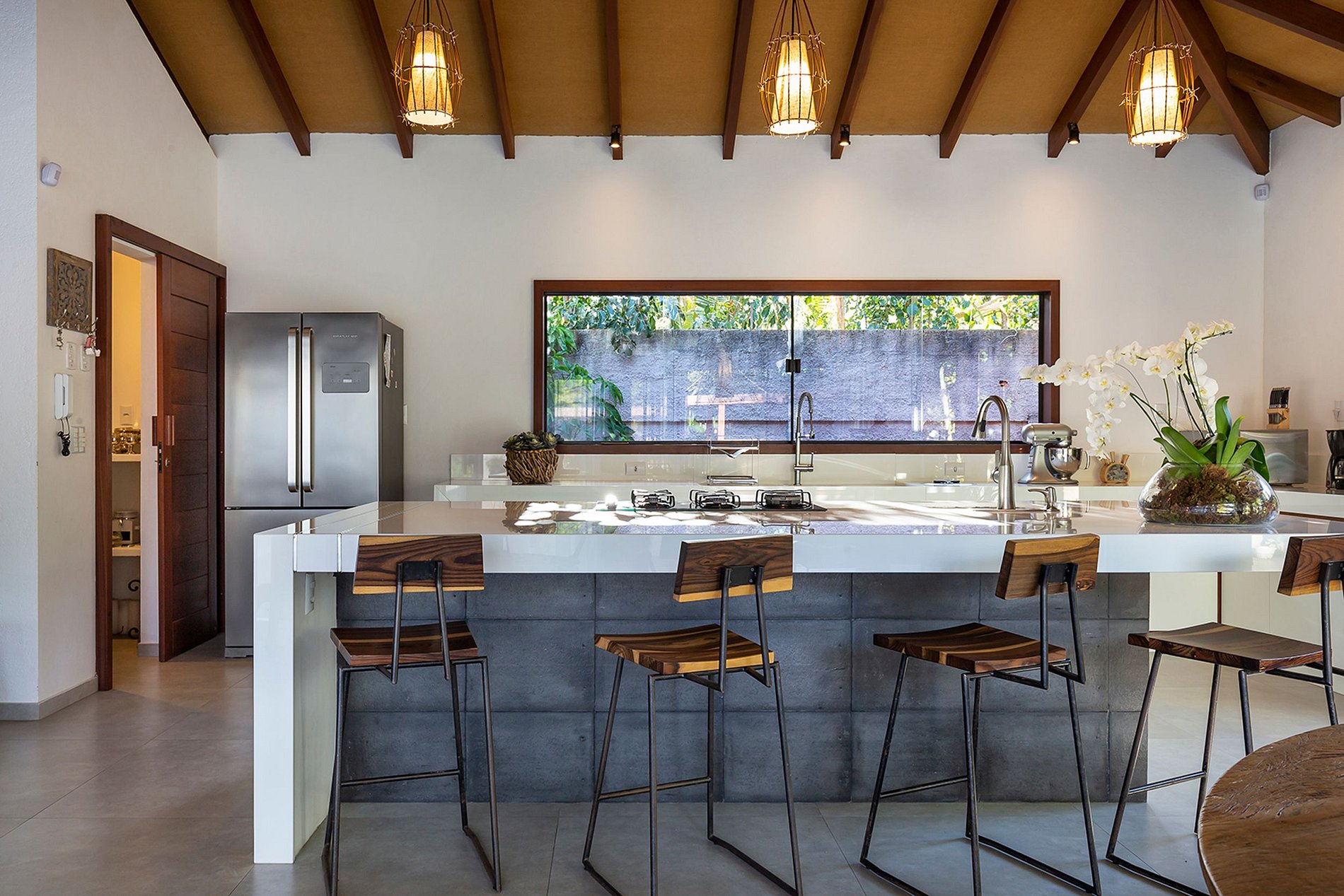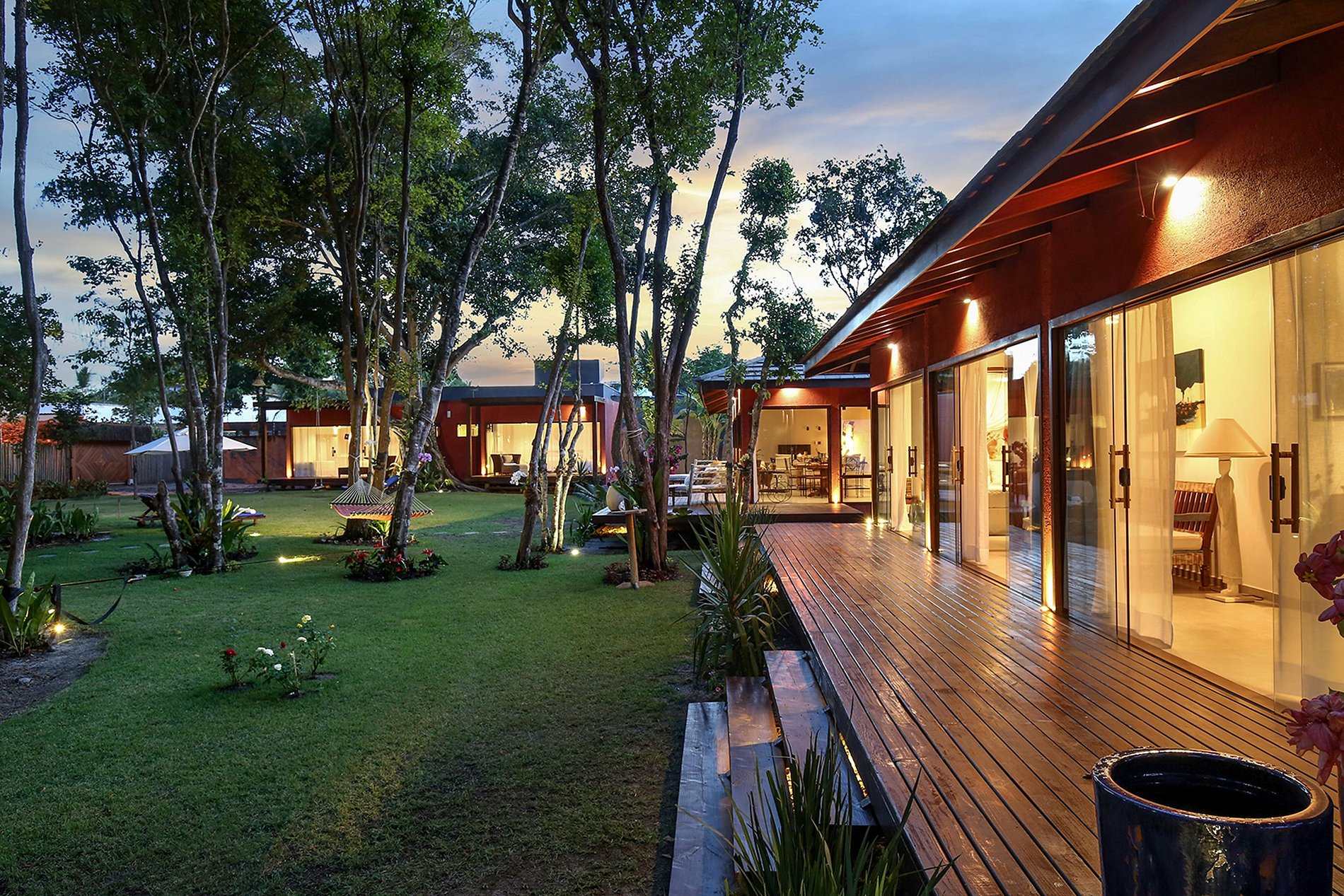 There are 2000 m² of land with a lush tropical garden, wonderfully well cared for. There are 375 m² of built area. It has 4 suites that are separated into two independent areas, and the social area is the central building. However, the biggest attraction is the large swimming pool. And a great gourmet area with barbecue and beer garden.