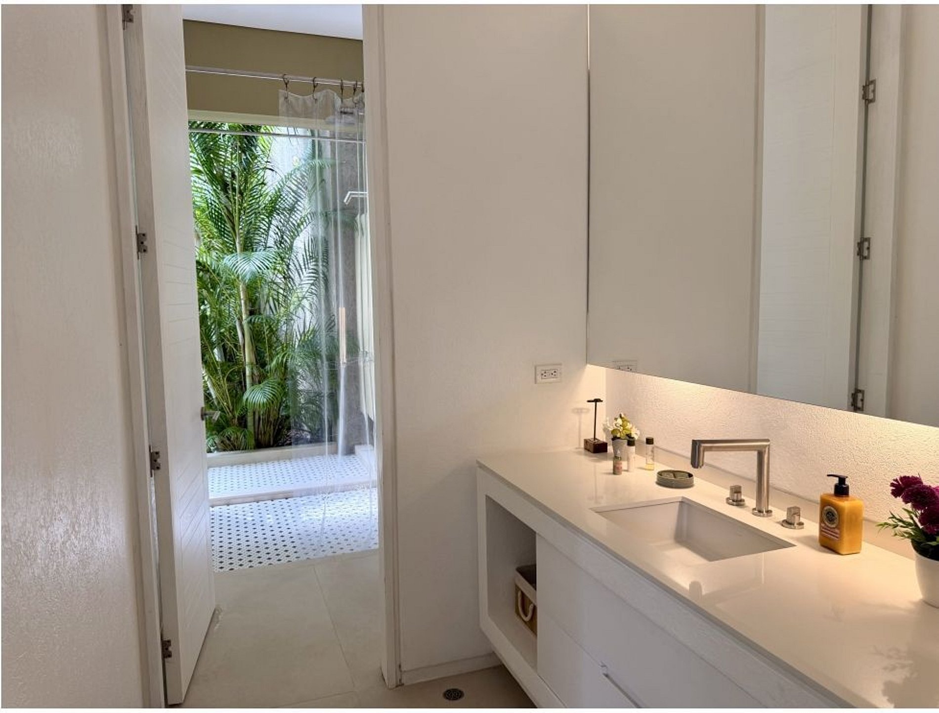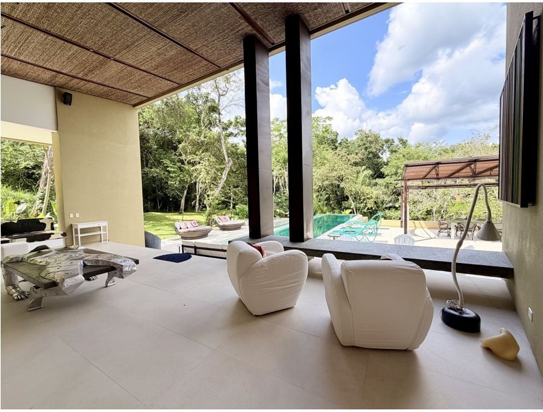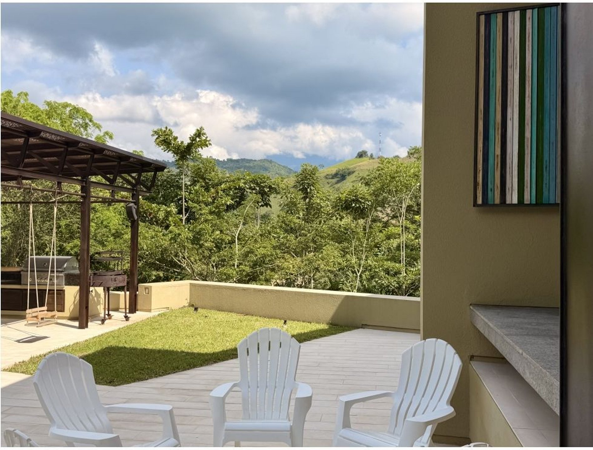 The home features panoramic mountain views and a morning sun orientation, creating a bright and refreshing atmosphere throughout the day. The social area is fully integrated and open, connecting the living room, dining area, and a spacious kitchen with breakfast bar. Large sliding doors open directly to the outdoor terrace, enhancing the connection with the surrounding greenery.