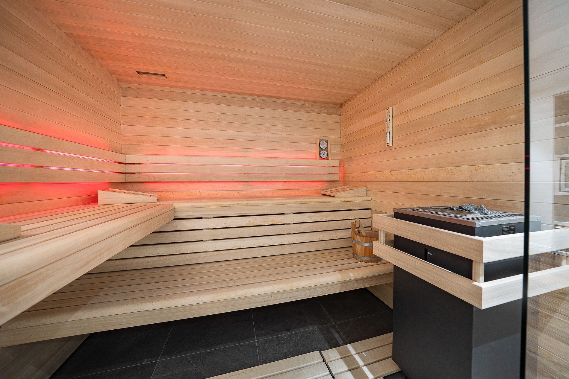 The lower level offers additional comfort and amenities, including an independent guest apartment with two bedrooms, as well as a dedicated wellness area featuring a gym, sauna, and massage room.