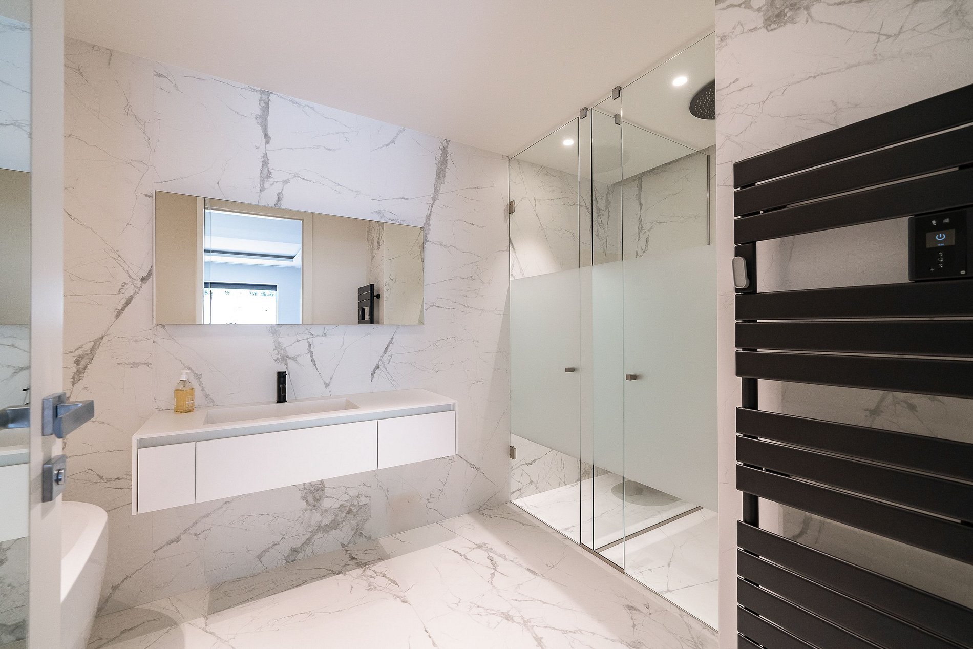 Upstairs, four beautifully appointed bedrooms each feature their own ensuite bathroom or shower room and open onto private terraces offering peaceful views of the surrounding greenery. The master suite stands out with its private TV lounge, walk-in closet, and luxurious ensuite bathroom.