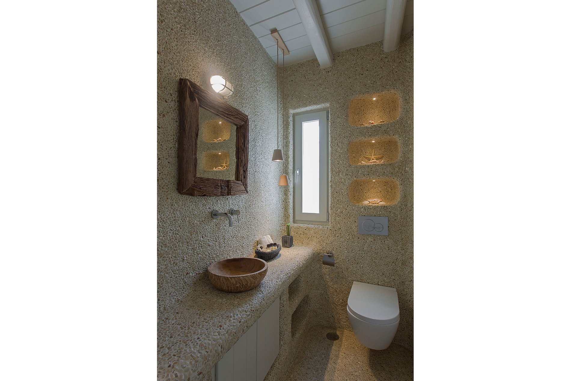 The interior is gracefully decorated and equipped with audio and video systems which include Smart TVs and a ceiling projector. The outdoor area hosts the 75m2 private infinity pool, a pool bar, built-in seating and sofas, and a large dining area.
