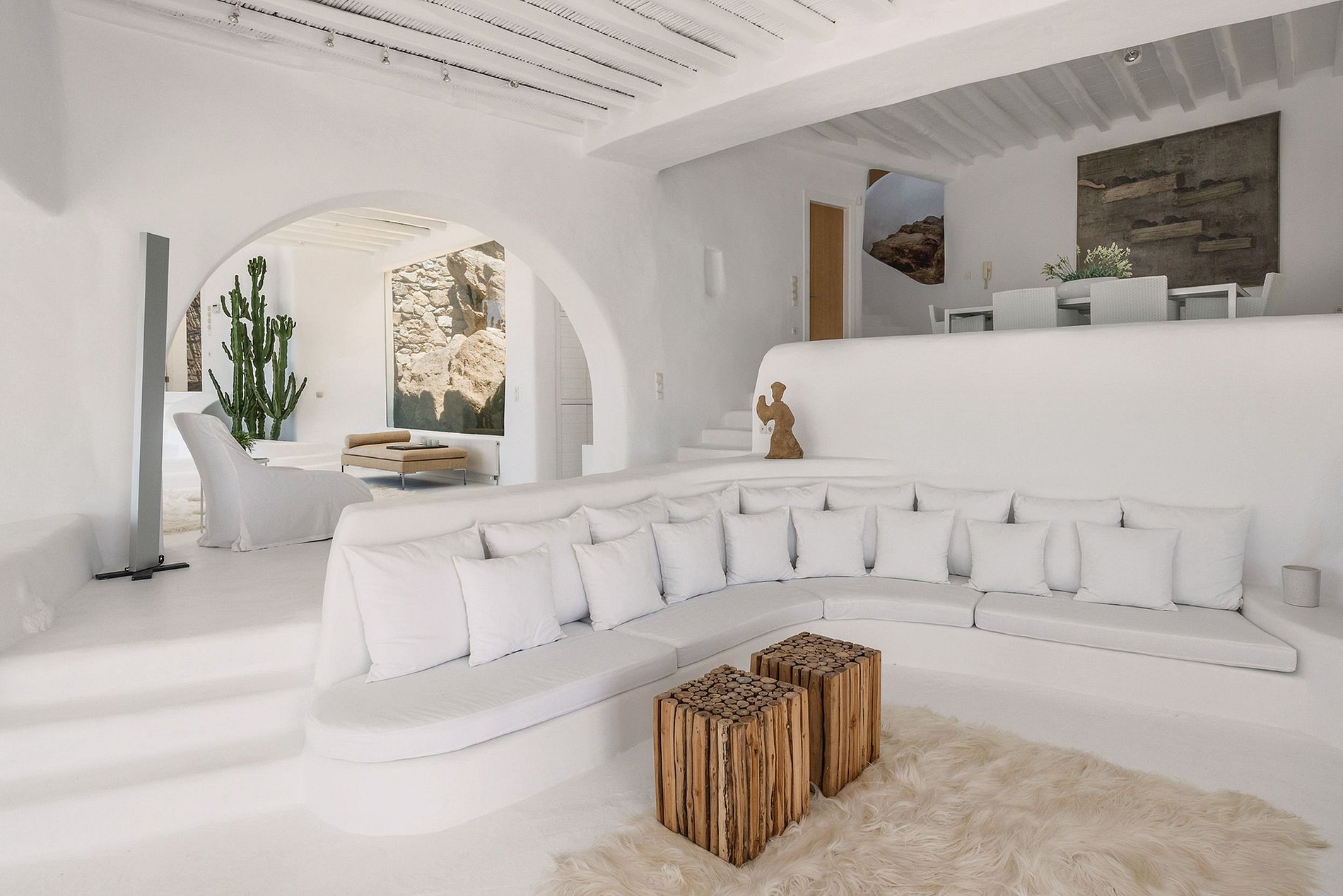Villa is situated in the Agia Sofia area overlooking the Aegean Sea, conveniently close to Mykonos Town and the new Port. It can accommodate up to 10 guests in its 5 en-suite double bedrooms. The white color dominates the traditionally designed interior with the built-in sofas and beds while the outdoor area features an infinity pool and a magnificent lounge with a bar at the upper level, with stunning sea views onto the sunset and Chora.