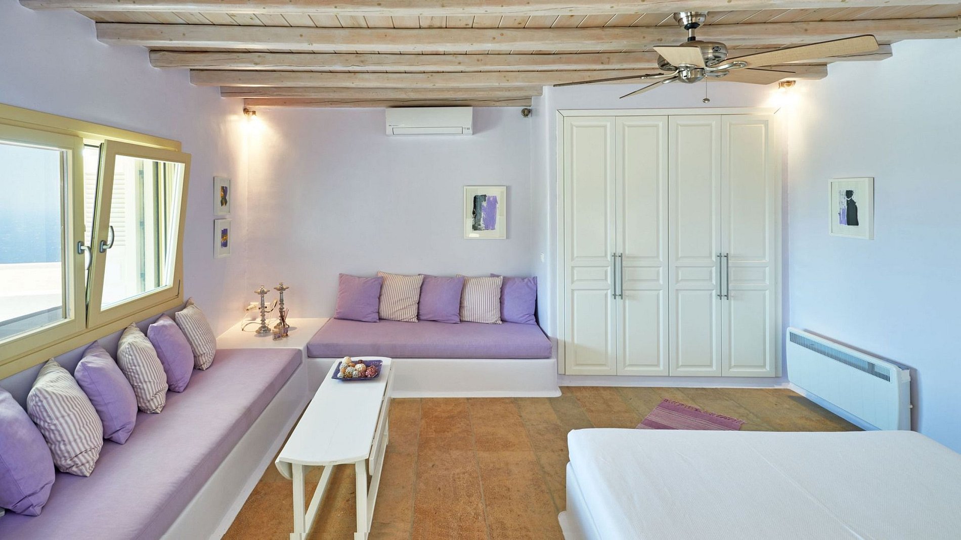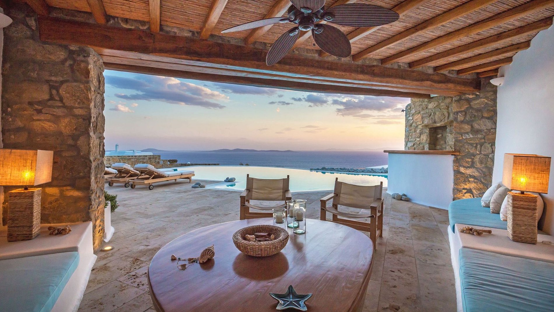 The marvelous villa, on the rocky coastline, is situated overlooking the Aegean Sea and magical sunsets. This is one of the most charming areas of the island: Tourlos, with deserted coves and tranquil waters mirroring the azure sky.