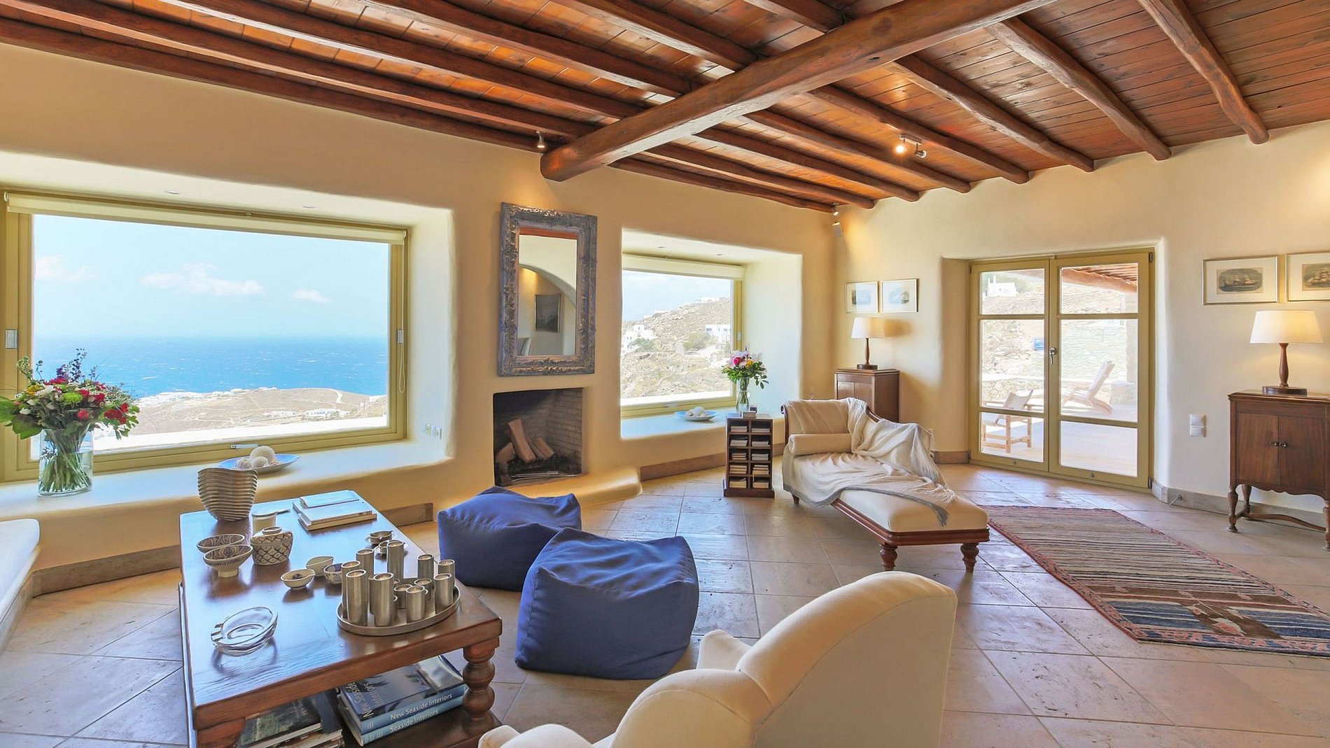 The marvelous villa, on the rocky coastline, is situated overlooking the Aegean Sea and magical sunsets. This is one of the most charming areas of the island: Tourlos, with deserted coves and tranquil waters mirroring the azure sky.