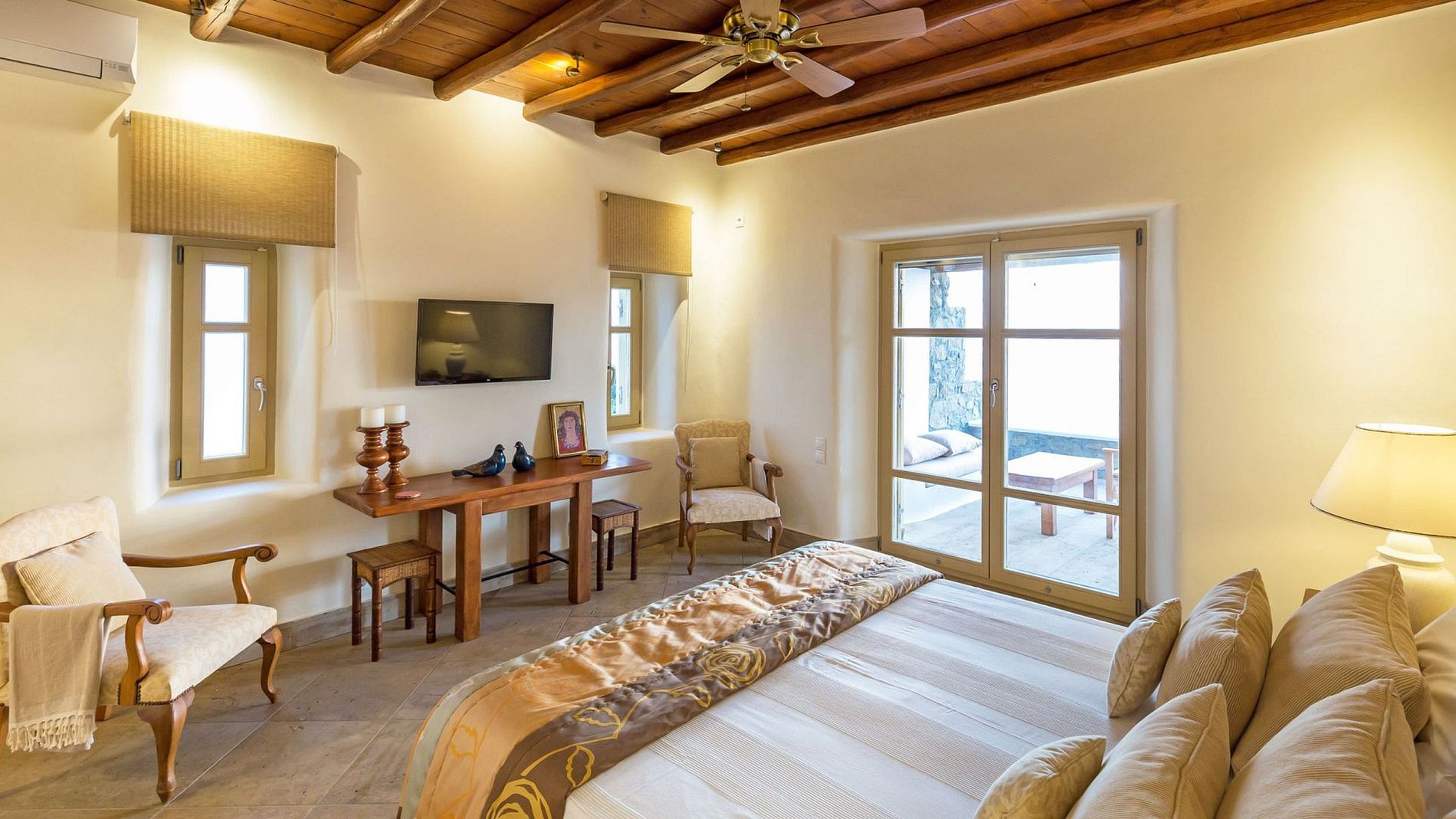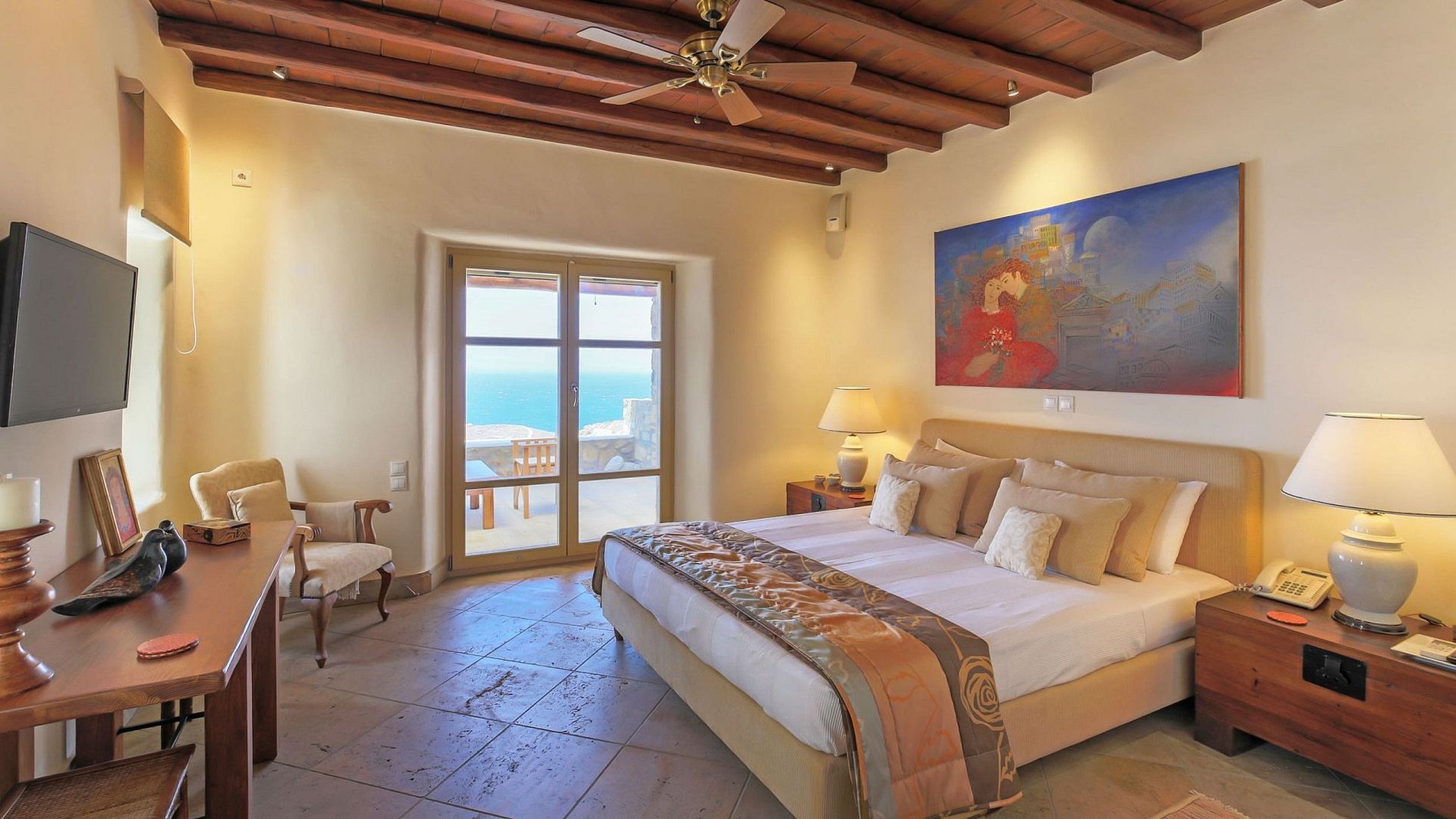 The property consists of the main villa with a living room, a dining area, a fully equipped kitchen, and 3 en-suite bedrooms, each with a sea view. Apartment with small living area, kitchenette, 2 bedrooms, and bathroom. Guesthouse with small living area, kitchenette, bedroom, and bathroom. The rooms feature the authentic and classic architecture of the Cyclades with sculpting arches and immaculate white walls. These delicate monochrome tones are highlighted in some places by superb paintings or rough stones walls.