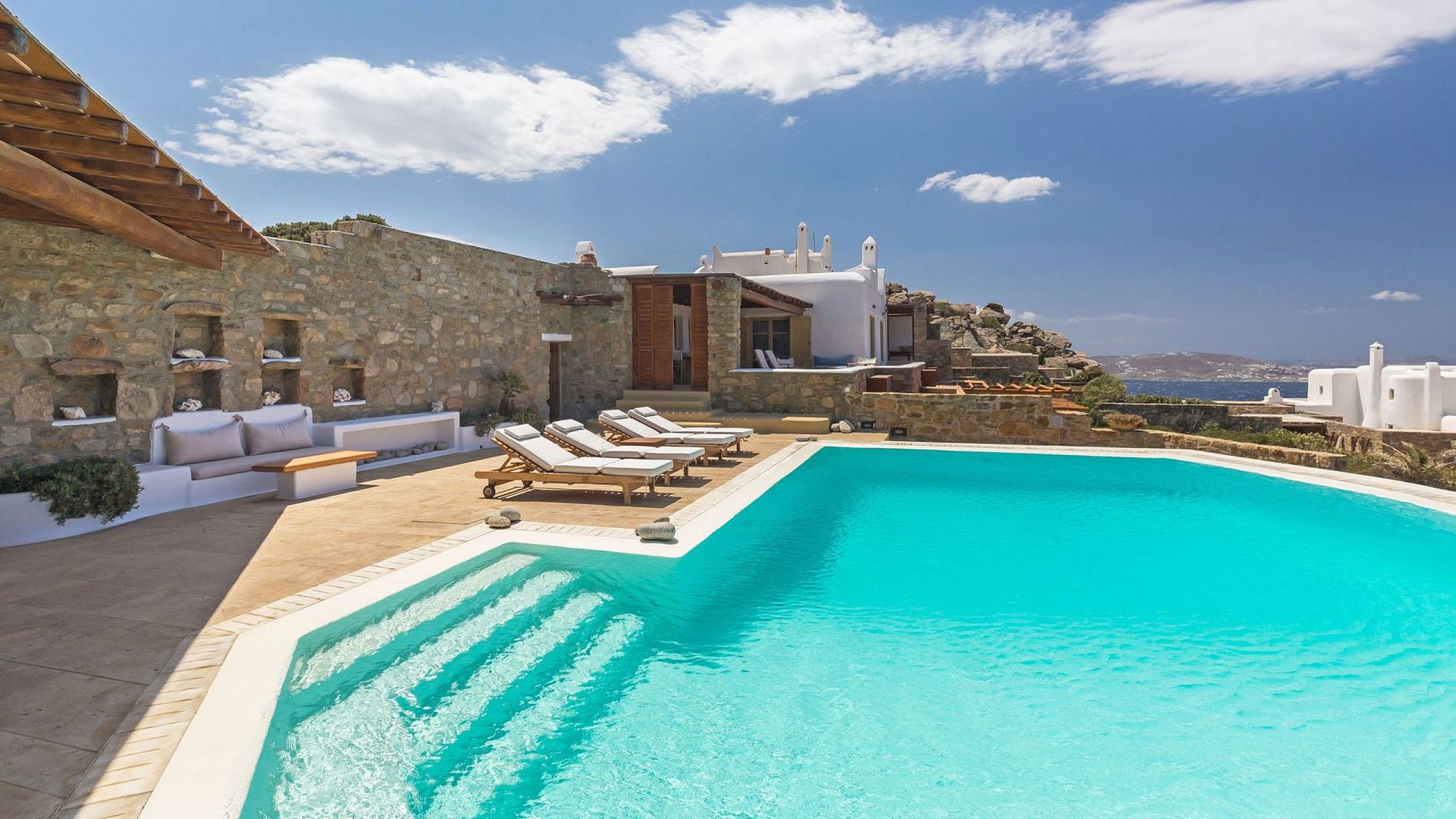 The marvelous villa, on the rocky coastline, is situated overlooking the Aegean Sea and magical sunsets. This is one of the most charming areas of the island: Tourlos, with deserted coves and tranquil waters mirroring the azure sky.