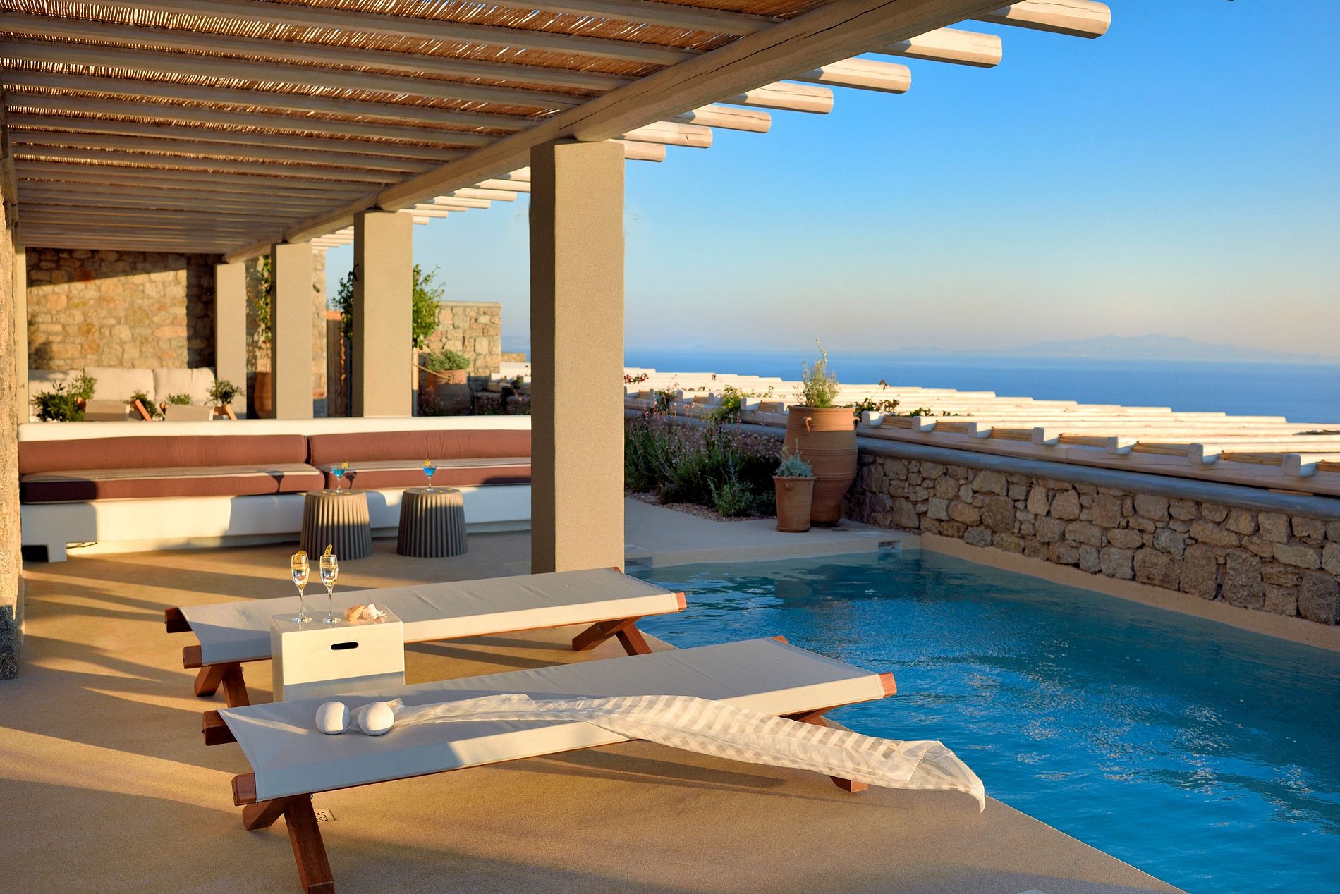 Villa with a total area of 150m2 that can accommodate up to 6 guests, featuring 3 master bedrooms with en suite bathrooms and an infinity view of the Aegean Sea from all the bedrooms. Terrace in front of every room, fully equipped kitchen, WC, living, and sitting room areas. The villa has its own private pool with Jacuzzi, magnificent outdoor dining and sitting areas that spread over 170m2.