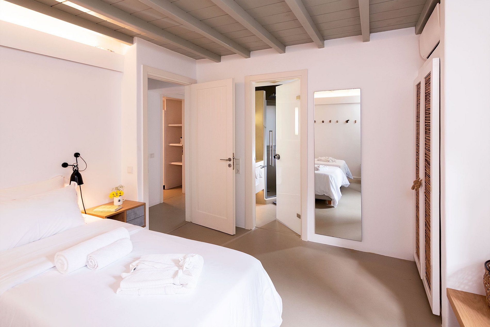 Villa with a total area of 150m2 that can accommodate up to 6 guests, featuring 3 master bedrooms with en suite bathrooms and an infinity view of the Aegean Sea from all the bedrooms. Terrace in front of every room, fully equipped kitchen, WC, living, and sitting room areas. The villa has its own private pool with Jacuzzi, magnificent outdoor dining and sitting areas that spread over 170m2.