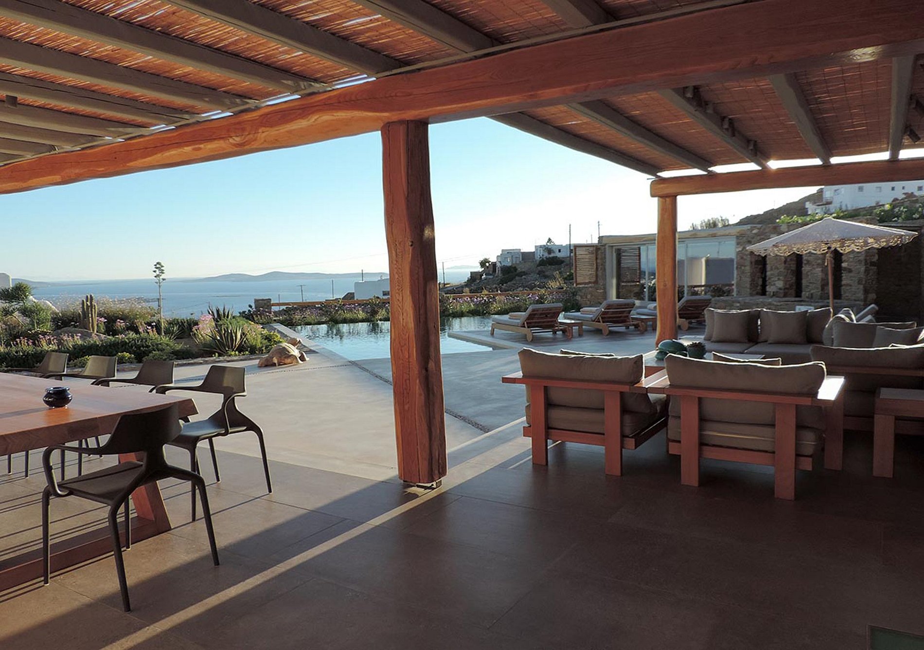 This villa located in the area of Agia Sofia combines state-of-the-art amenities with the traditional Cycladic style. The architecture is based on the use of natural materials, such as stone and wood, to ensure permeating light and to offer guests an inimitable open-space experience. Only a few minutes away from the picturesque town of Mykonos, this peaceful area is the perfect location for those seeking a relaxing holiday in a beautiful setting, while being so conveniently near restaurants and bars.