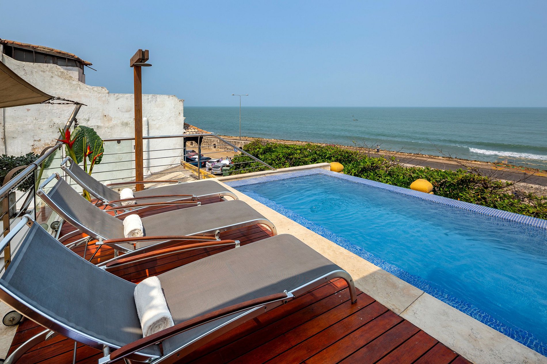 The top floor offers two further bedrooms as well as access to the second pool. This area is reached by a corridor, flanked, and surrounded by more plants. The open leisure spaces are ideal for sunbathing, enjoying a barbecue, or relaxing in a jacuzzi while gazing at the ocean with a glass of champagne in hand. Let the magic of Cartagena unfold to you by staying at this magnificent property.