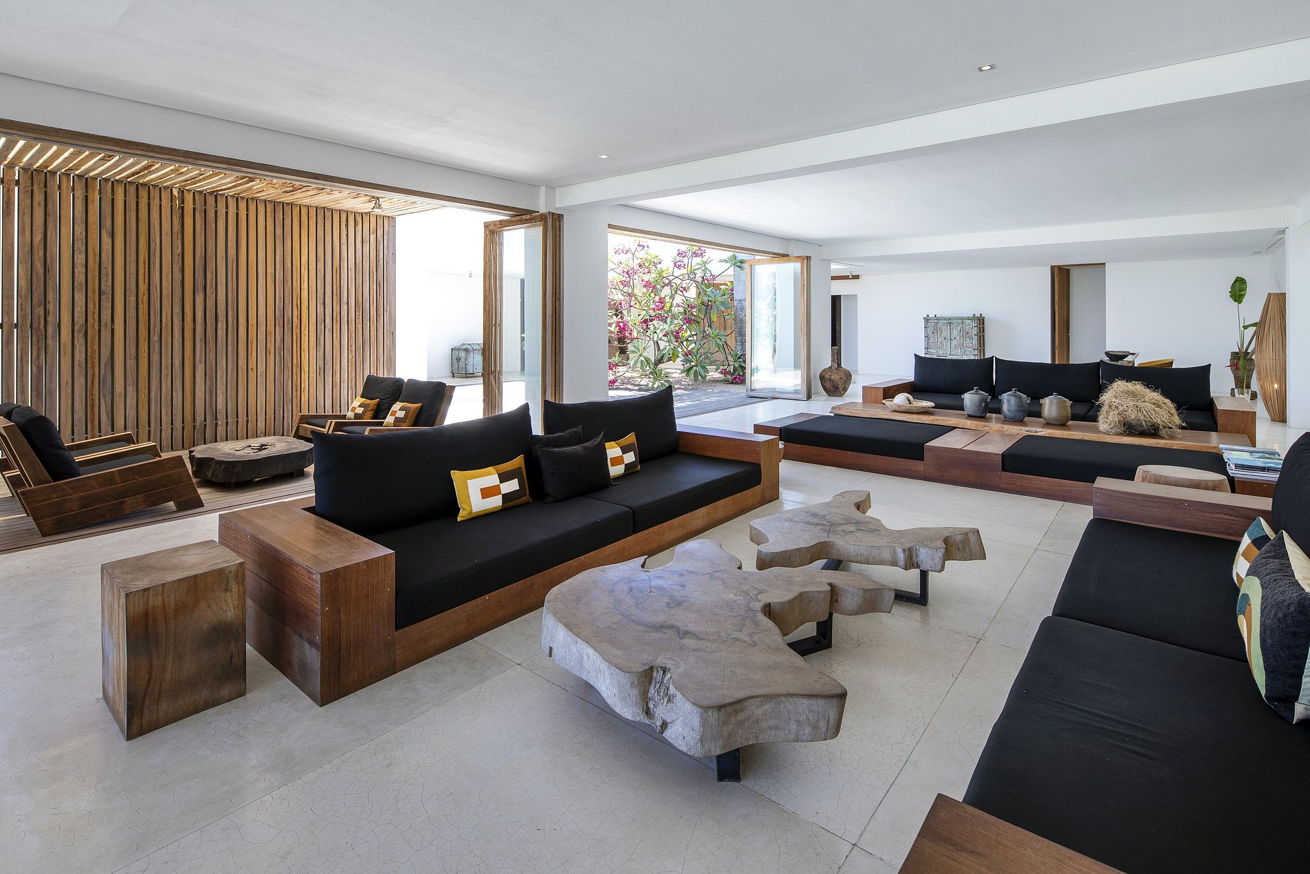 The huge and bright living room with wooden furniture designed just for the villa, large wooden pool deck, and long US kitchen are open on the seducing pool and large green field running which is spreading down to a private white sand river beach.