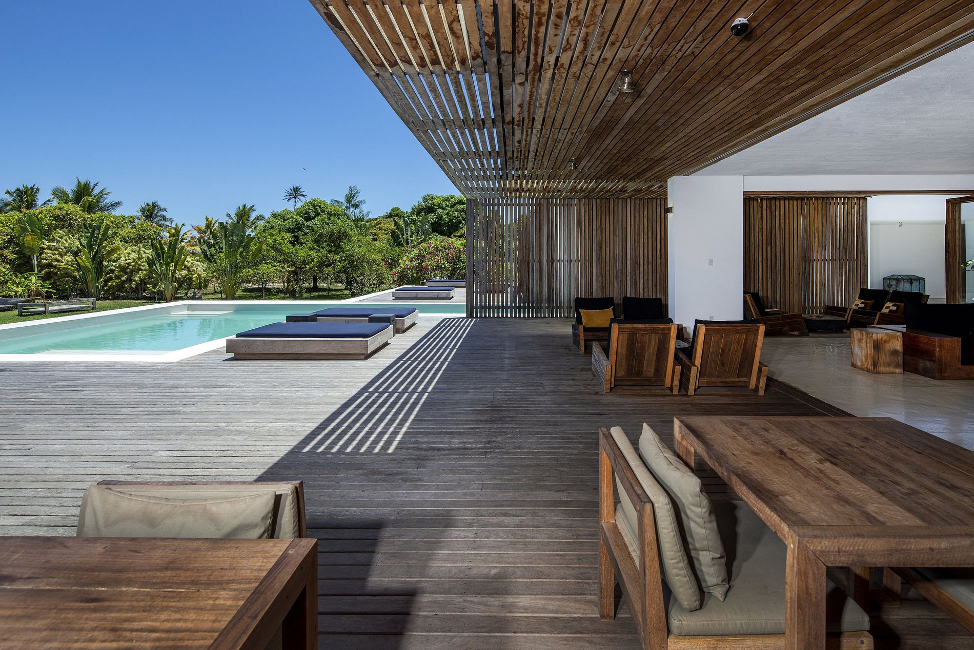The huge and bright living room with wooden furniture designed just for the villa, large wooden pool deck, and long US kitchen are open on the seducing pool and large green field running which is spreading down to a private white sand river beach.