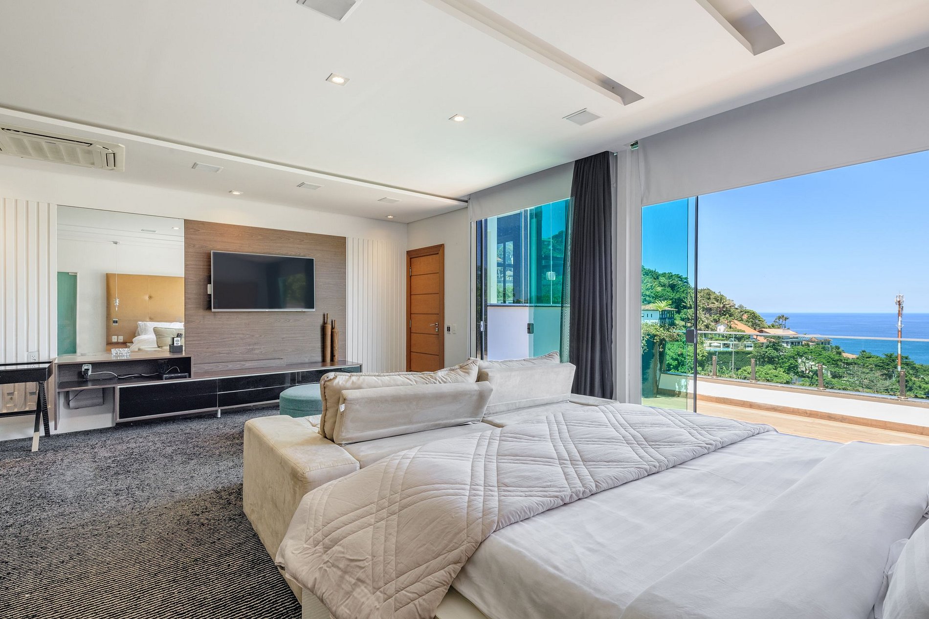 The luxurious interior of this one of a kind mansion leaves no wish unfulfilled. The living and dining rooms are very open and wide designed with high ceilings -modern and comfortable at the same time. There is also a bar aligned to the living room which gives the place a loungy atmosphere, for sure you will spend some unforgettable evenings with your beloved ones here. Furthermore, the place possesses a spacious professionally equipped gym and a sauna. All of the 6 Suites are aligned to the Ocean with big panoramic windows, making sure you can enjoy the amazing view from every angle of the mansion. Besides that, all bedrooms are coming with ACs, cable TVs and en-suite bathrooms.