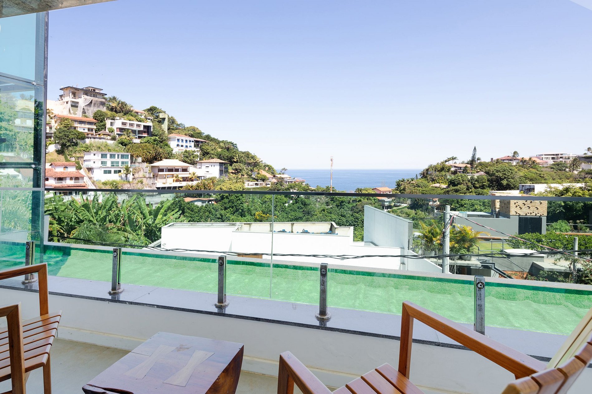 The lush green of the beautiful nature which surrounds Joa and the maritime blue of the ocean is generating a glorious play of colors. The best way to enjoy this jaw-dropping view is on the tropical designed sun-loungers of the immense masterly constructed terrace with infinitive effects. If you feel to cool down from Rio´s heat, there is no better place than the chic swimming pool embedded in the terrace.