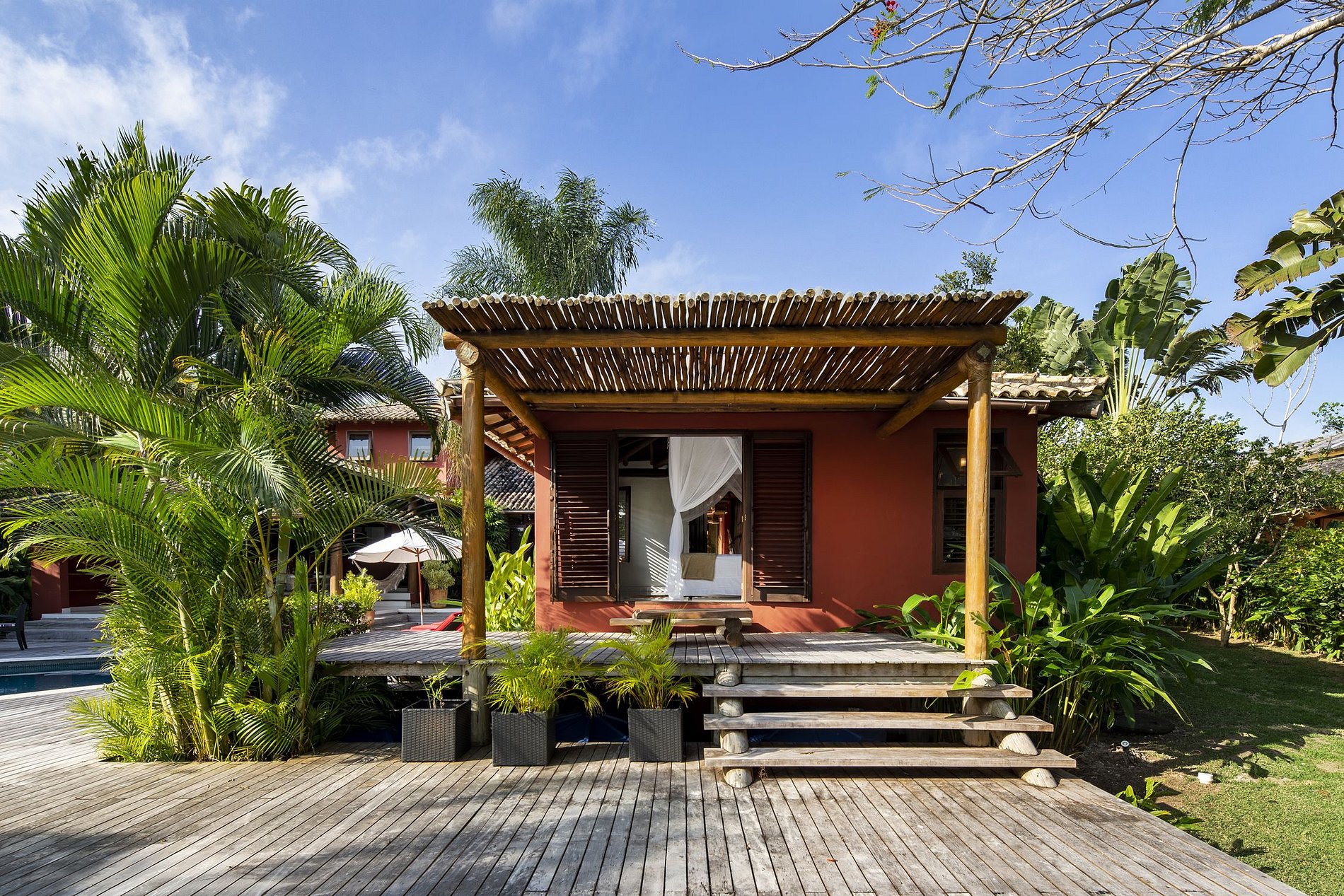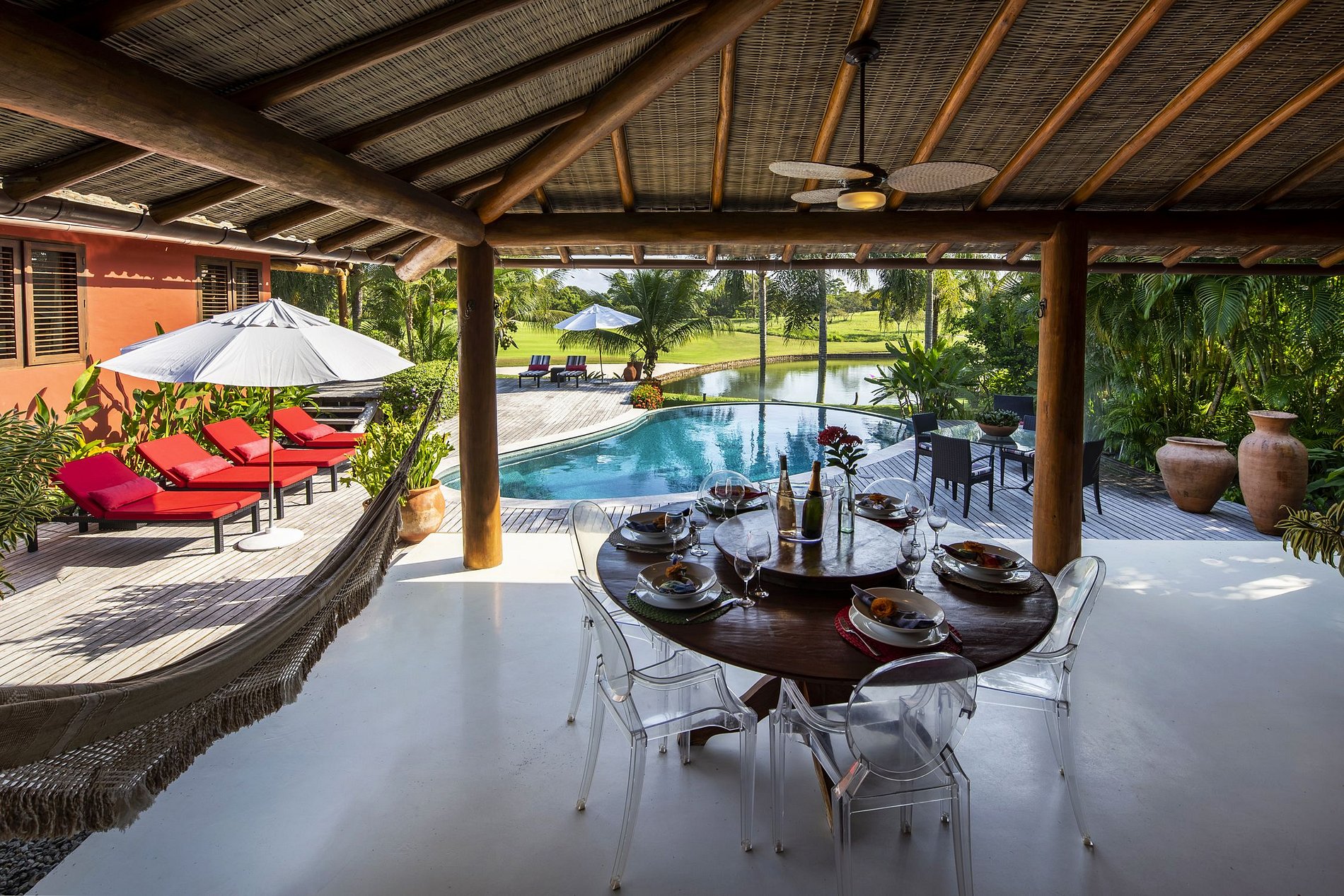 Furthermore, the fact that it's located on the famous Discovery Coast, where over 500 years ago the Portuguese discovered the country, gives the Terravista Golf Course an amazing historical and cultural value.The villa comes with a 1.900 square meter outdoor area. Every inch is dreamfully designed and arranged to leave no wish unfulfilled.Splendid wooden terraces in the back and in front of the villa with loungy furnitures, an amplious swimming pool, hammocks, an exotic garden and a covered outdoor dinning area.