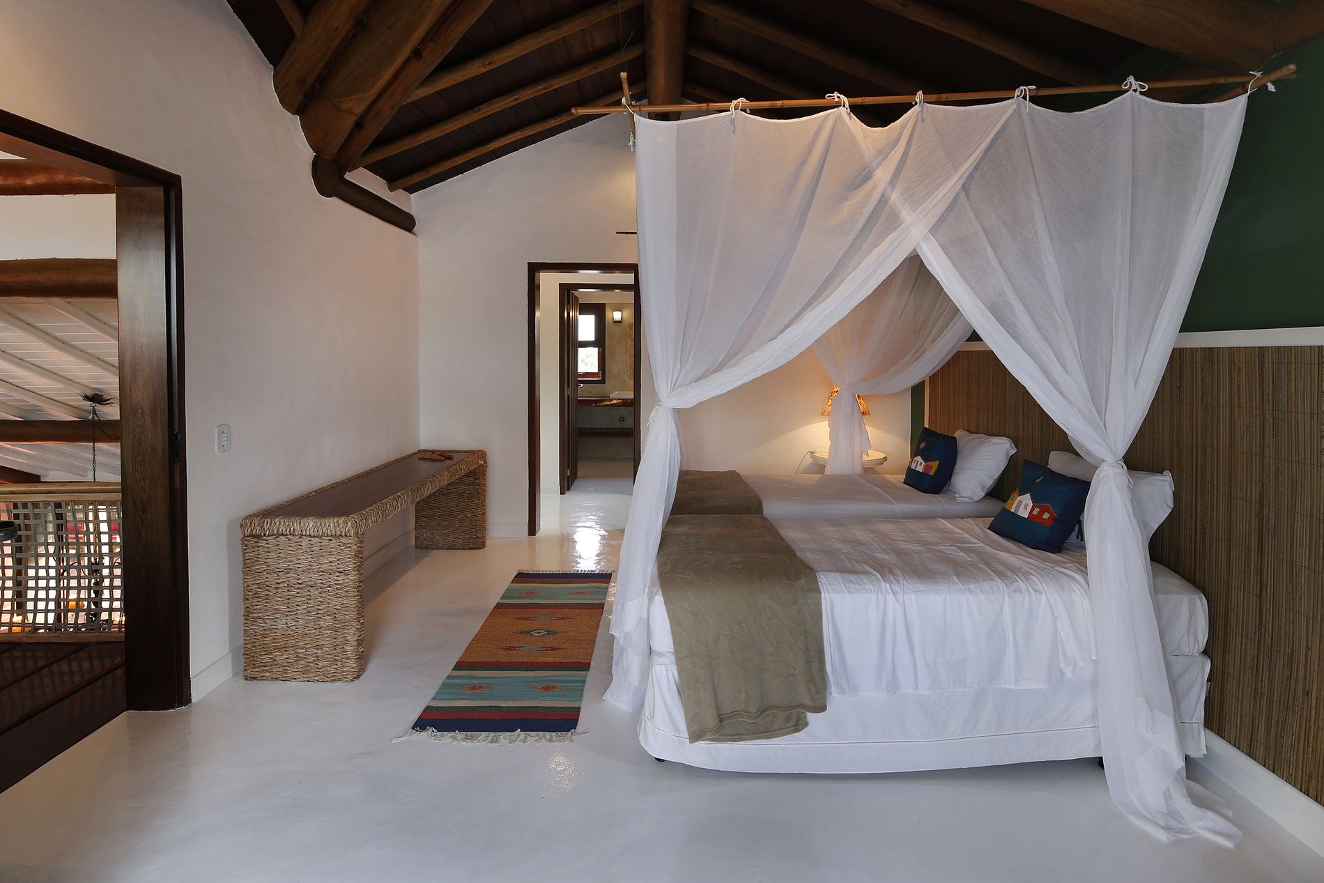 The noble master suite comes with a spacious luxuriously equipped bathroom, which possesses a jacuzzi, great the relax your body and mind after an exertive day on the golf course or on Trancoso long withe sand beaches, there are three more suites, two with kind sized beds and one with two single beds, with two simple extra beds, generating all in all a capacity for 10 guests. Every suite offers a different beautiful view.