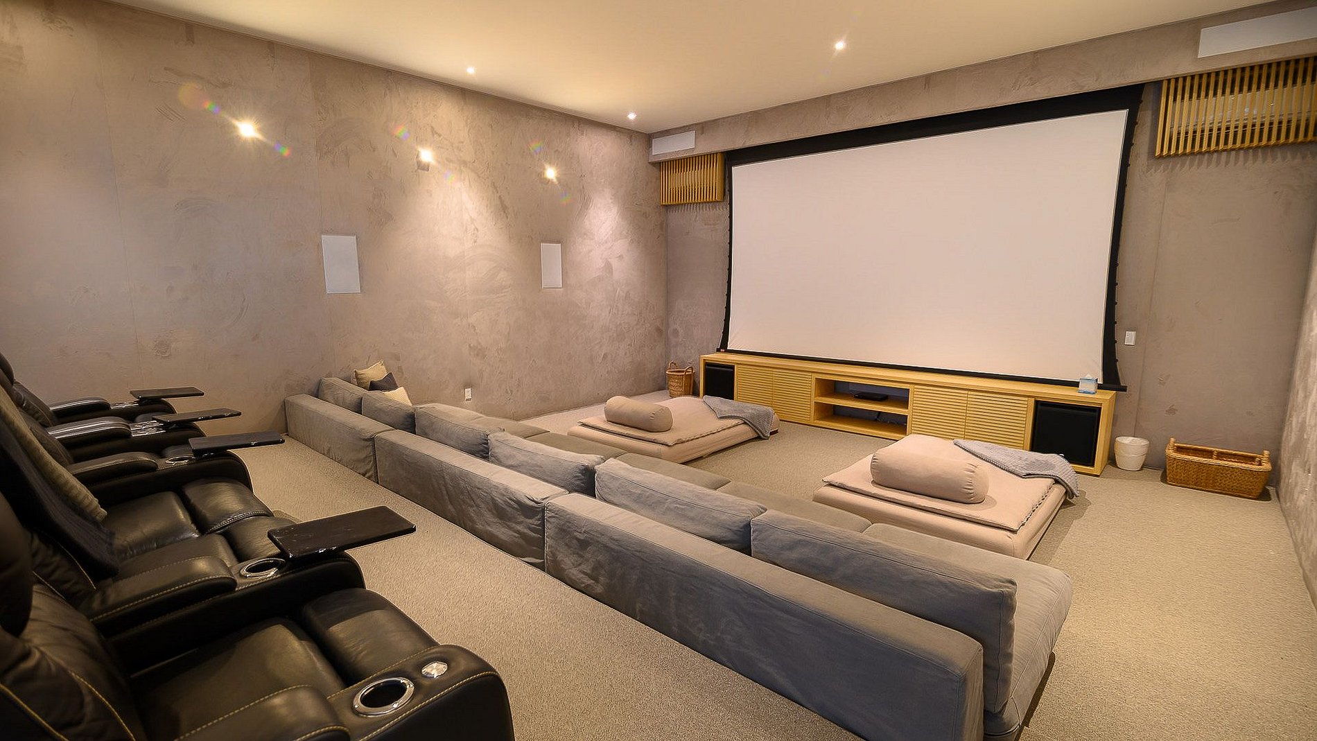 At the center of the outdoor space, a 36-meter heated infinity pool and jacuzzi overlook the ocean, complemented by multiple lounging areas, sun deck, and al fresco dining settings. The property is equally designed for entertainment, featuring a fully equipped game room and home cinema with pool table, bar, shuffleboard, foosball, and large-format screen.