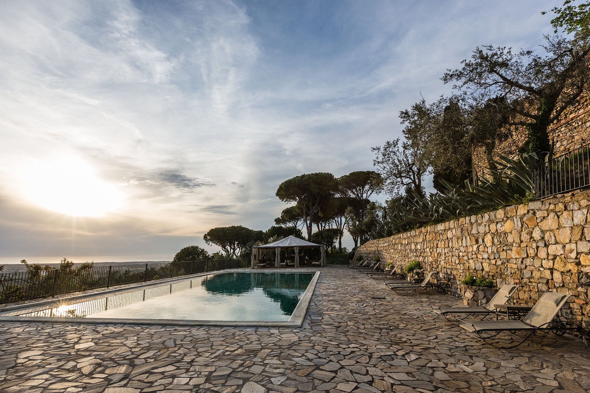 The interiors include 13 rooms with bathrooms, an open-space kitchen, 2 living-rooms, one library, one study, and a playroom. The exteriors host an ancient tower, a medieval church, a Carrara marble swimming pool, a gym, and a tennis court. The property also includes access to a private beach cabana by the sea.