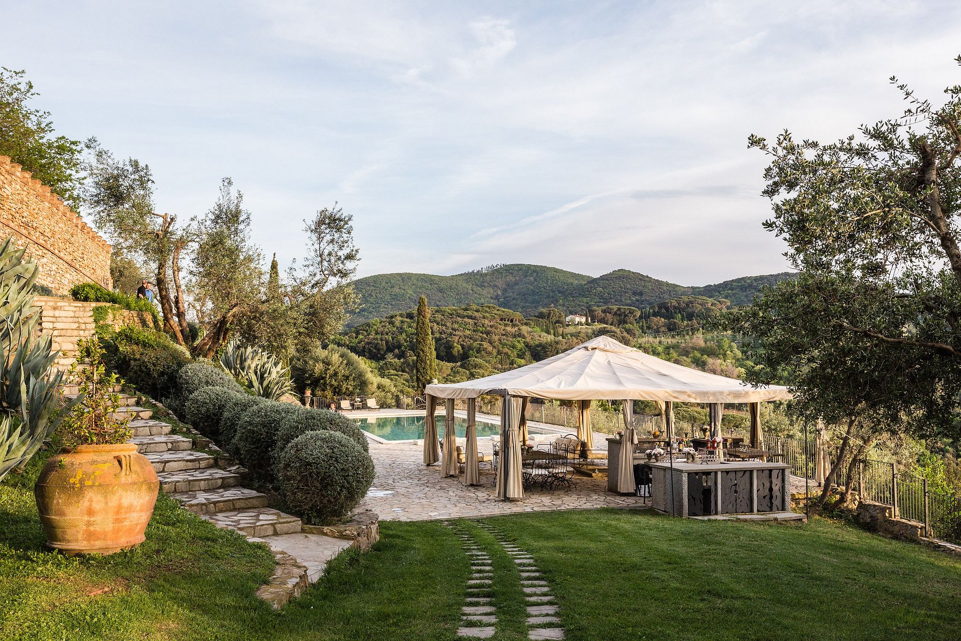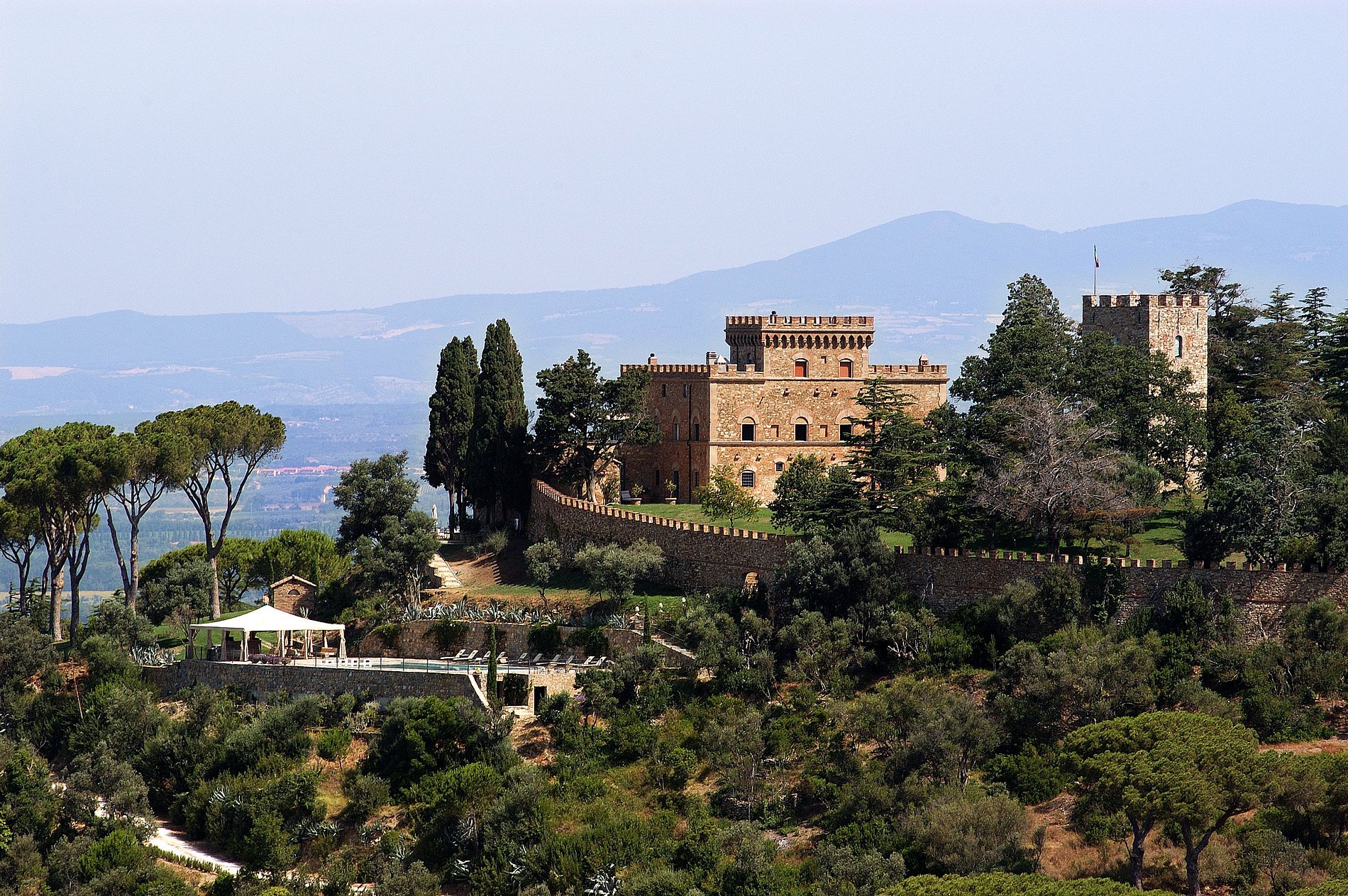The castle is situated in an extraordinary superb setting, surrounded by the Tuscan hills, 10 minutes from the sea, and overlooking the historical town of Castagneto Carducci.