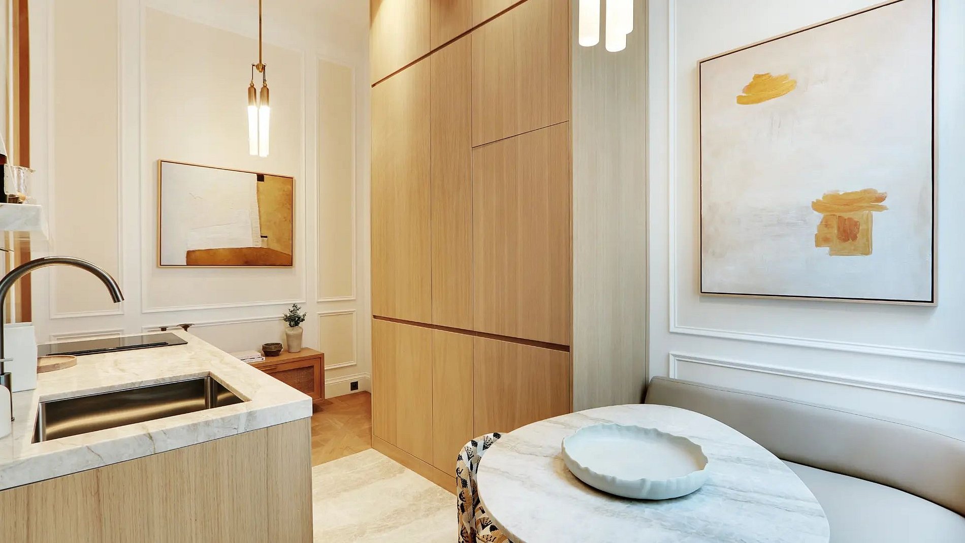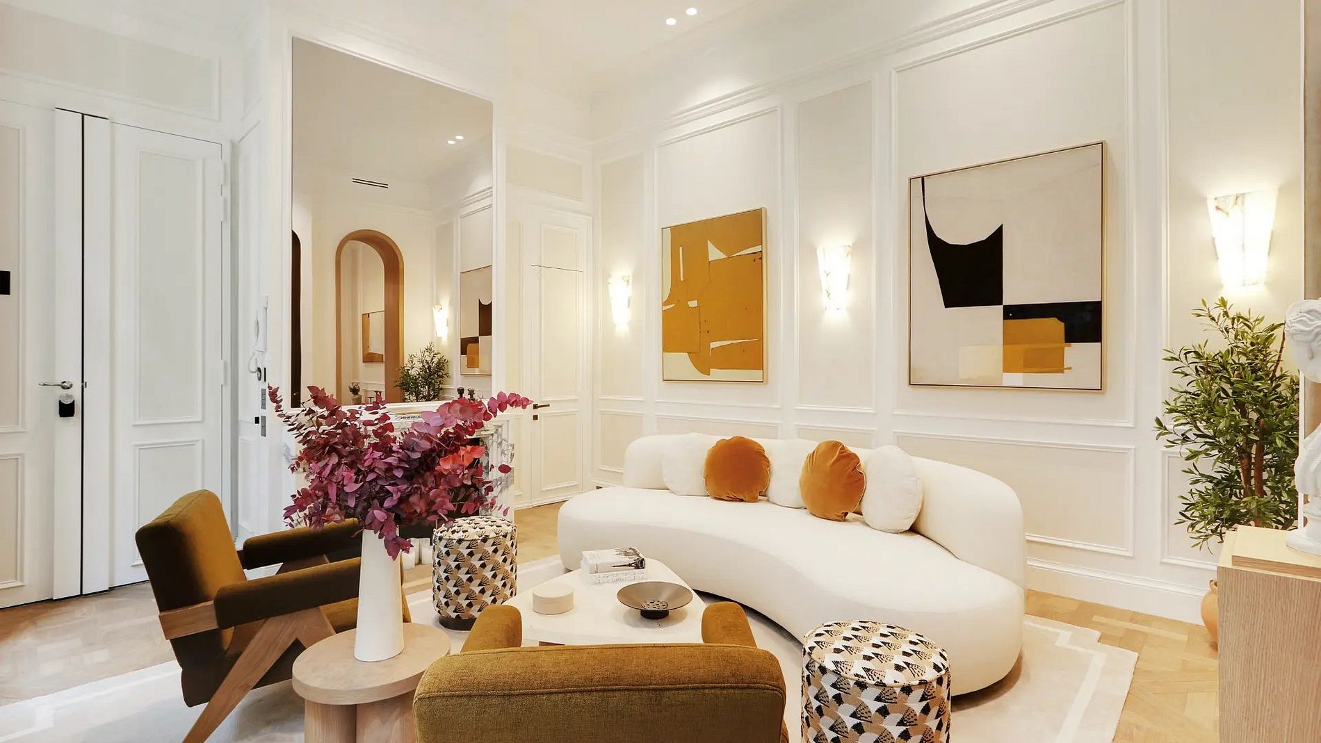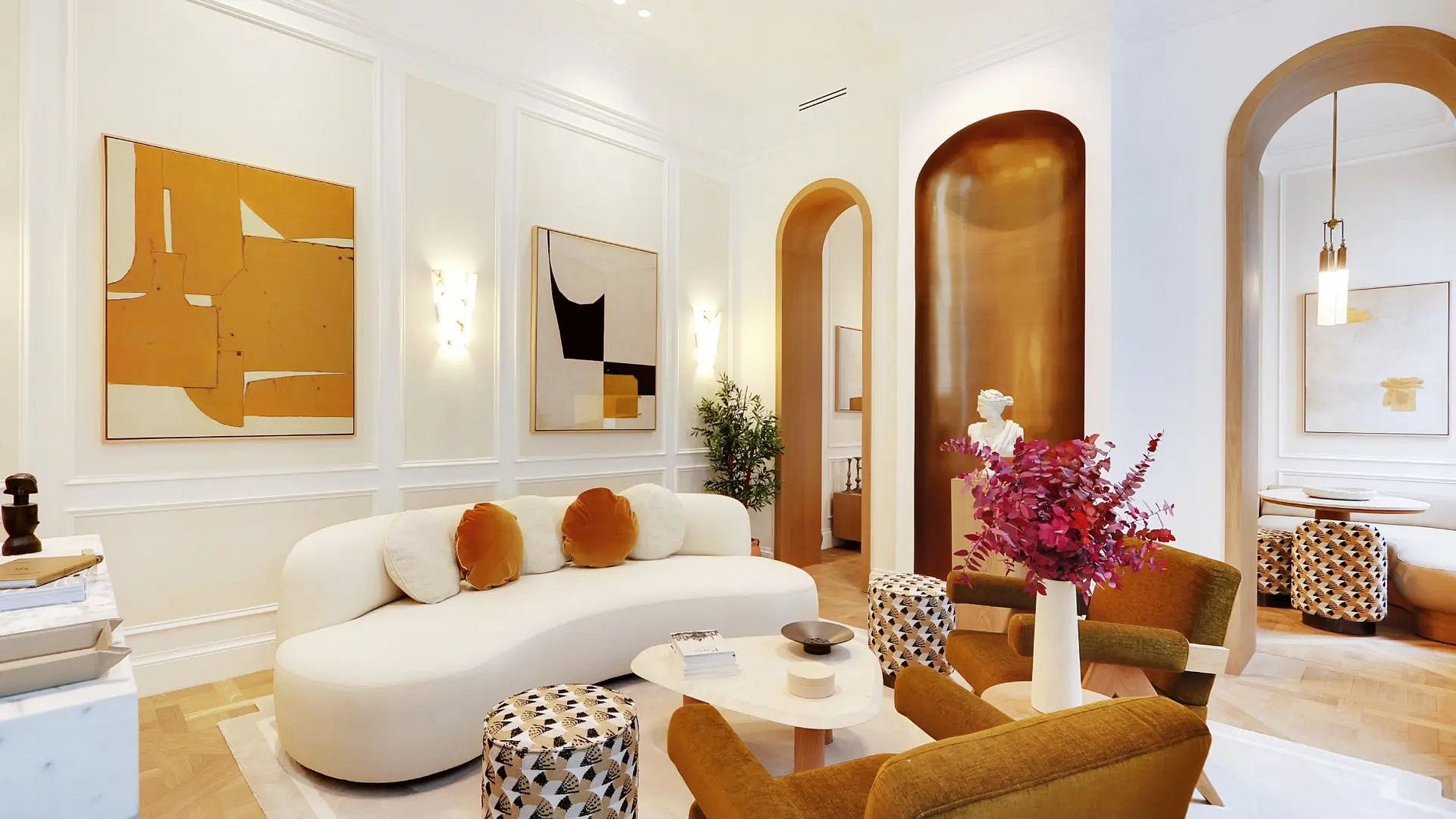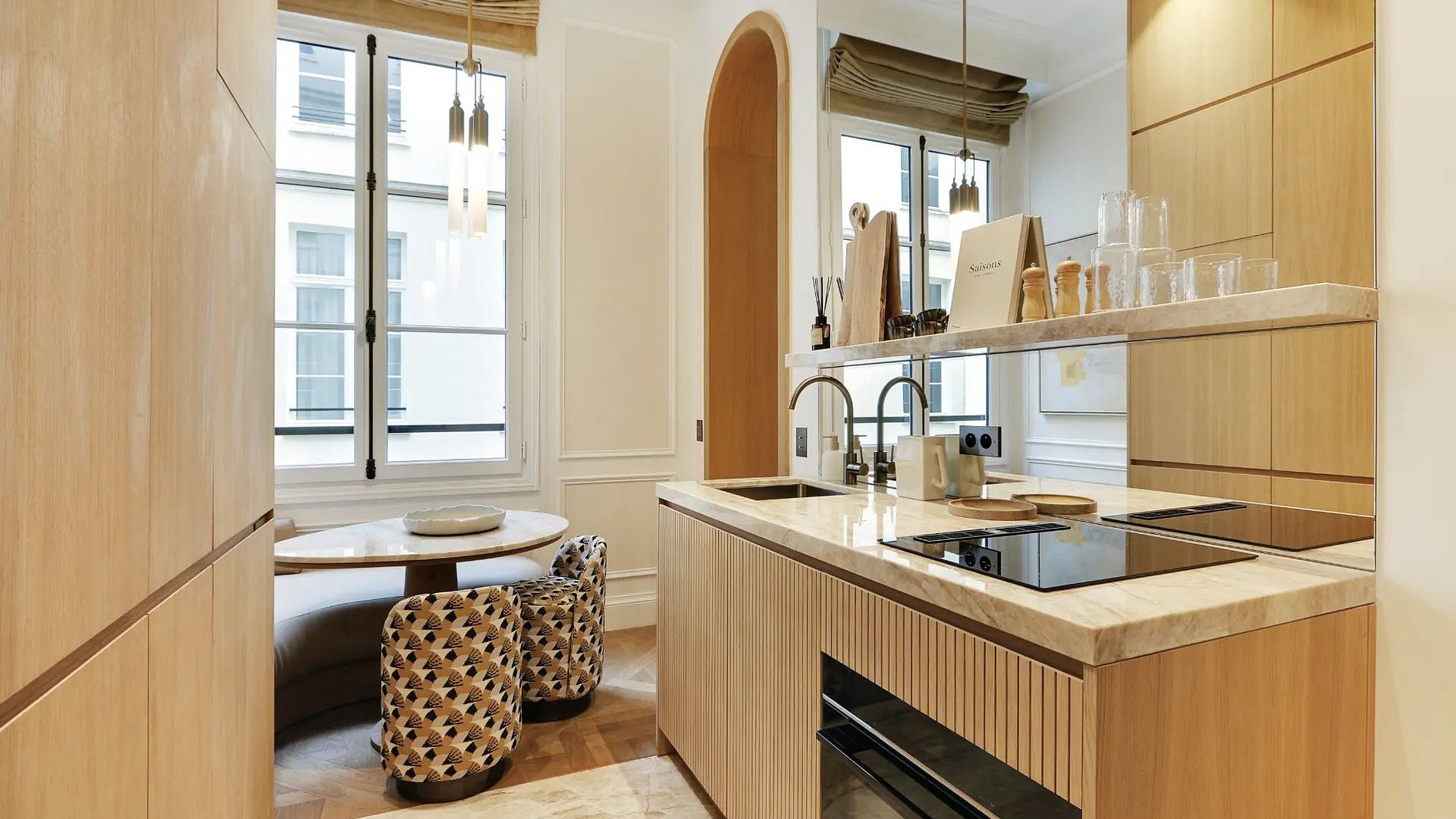 The apartment opens onto a bright living room where a beautiful lounge is combined with a peaceful and pleasant dining area. The architecture of this room is made of curves to have softer, more elegant structures with originality. Thus, discover the two arched passages leading you directly into the kitchen, functional and fully equipped. It is composed of noble materials, just like the rest of the apartment.