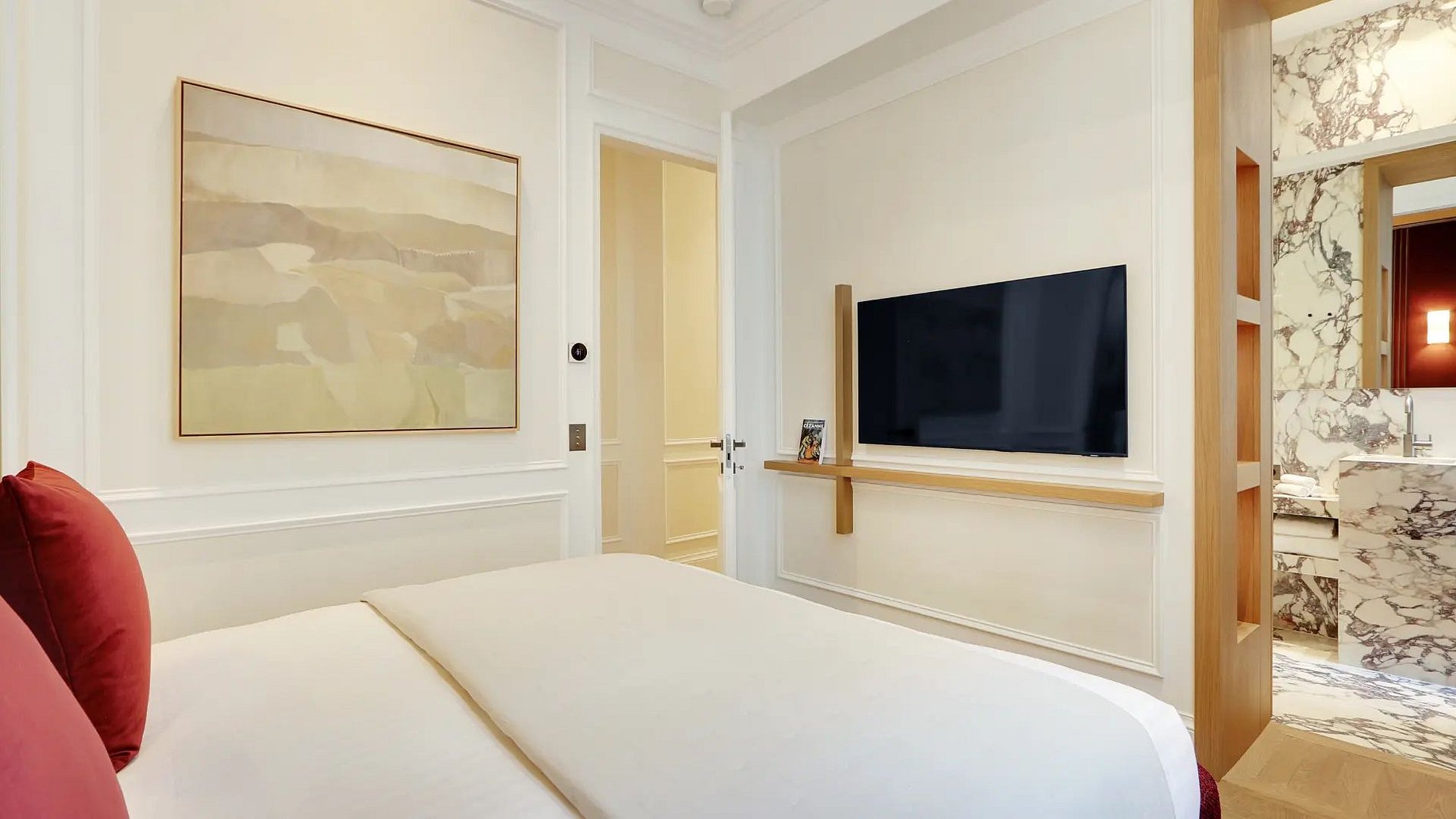 The apartment opens onto a bright living room where a beautiful lounge is combined with a peaceful and pleasant dining area. The architecture of this room is made of curves to have softer, more elegant structures with originality. Thus, discover the two arched passages leading you directly into the kitchen, functional and fully equipped. It is composed of noble materials, just like the rest of the apartment.