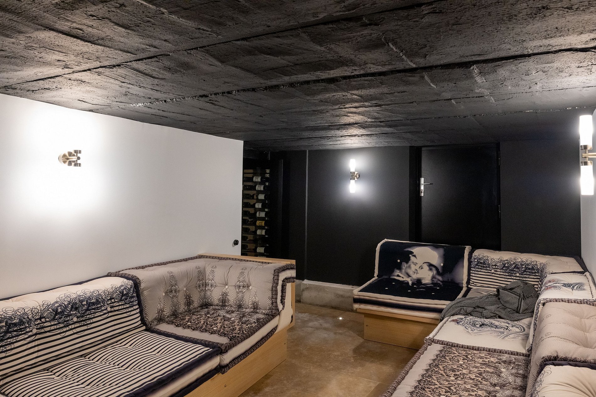 Beneath the château, discover an exceptional wine cellar, furnished with a dining area and TV lounge, perfect for tastings and convivial moments.