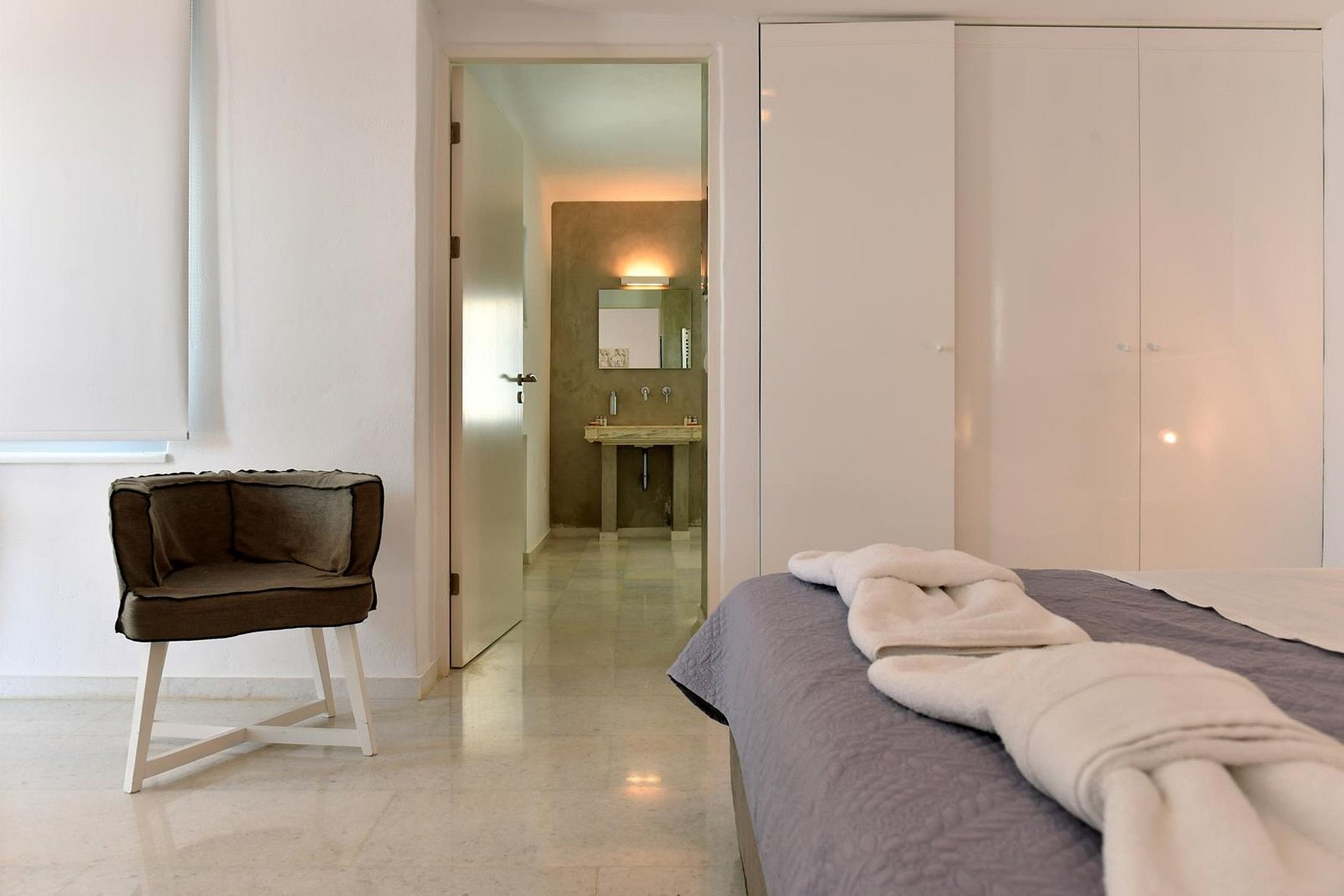 Accommodating up to 10 people, the property is divided into one main house and 3 guest houses. The main villa consists of 2 master bedrooms in natural white and wooded colors, each with a private bathroom offering stunning views of the sea and early morning sun.
