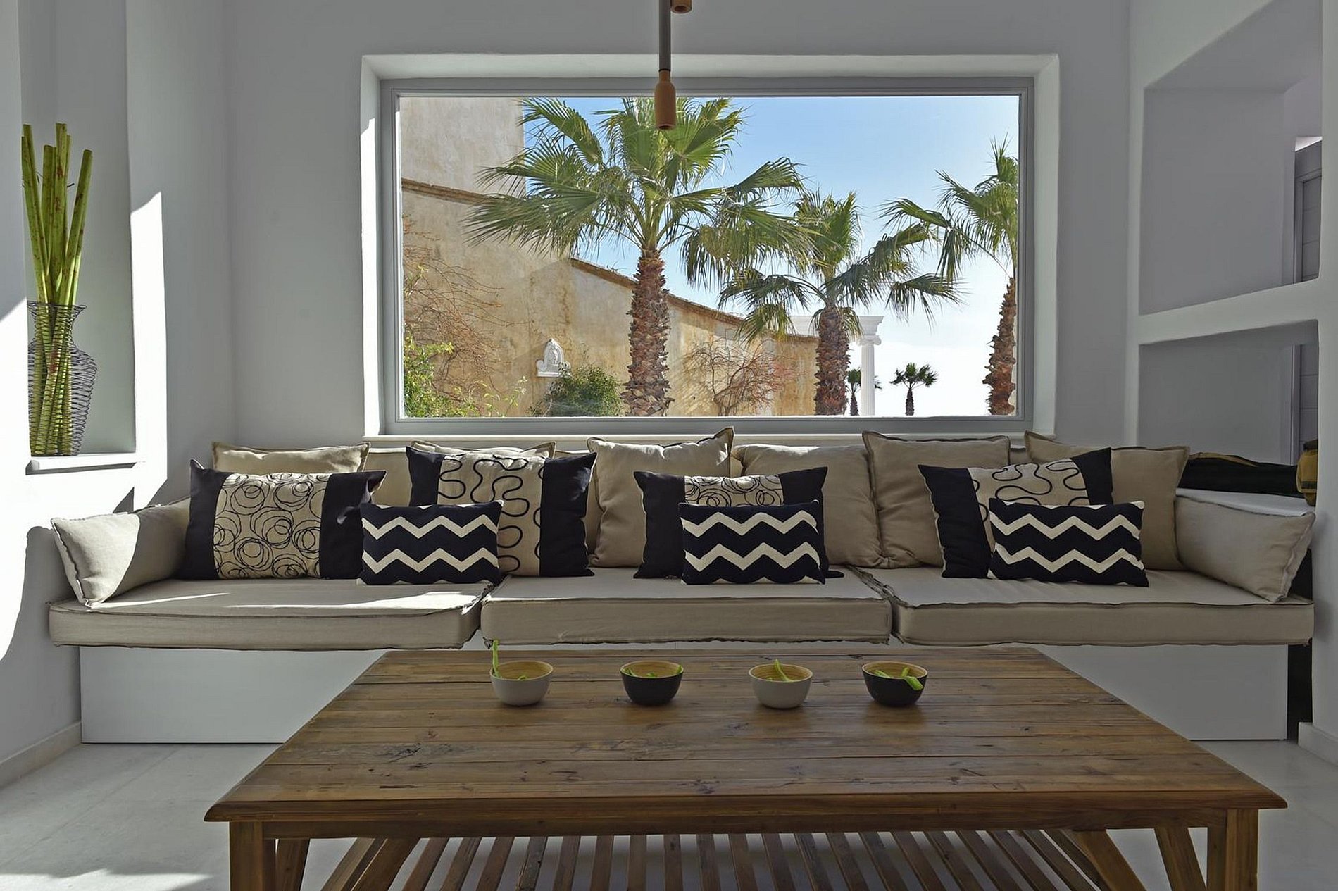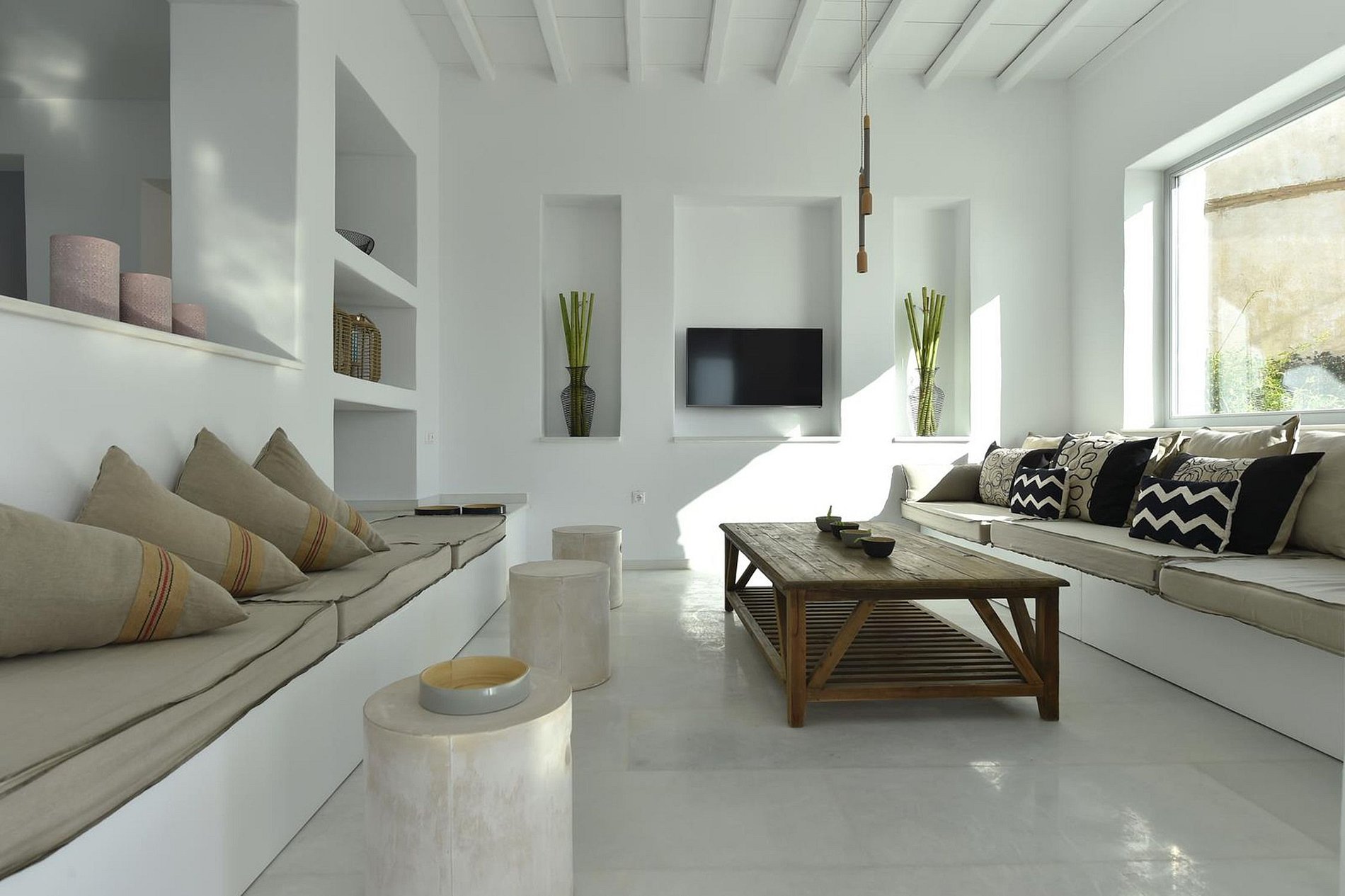 The interior of the villa is built around a large living room with exposed white beams and an elegant dining room featuring a raw wood table. On the other side, the living space is built around a modern fireplace with shades of marble cream colors.