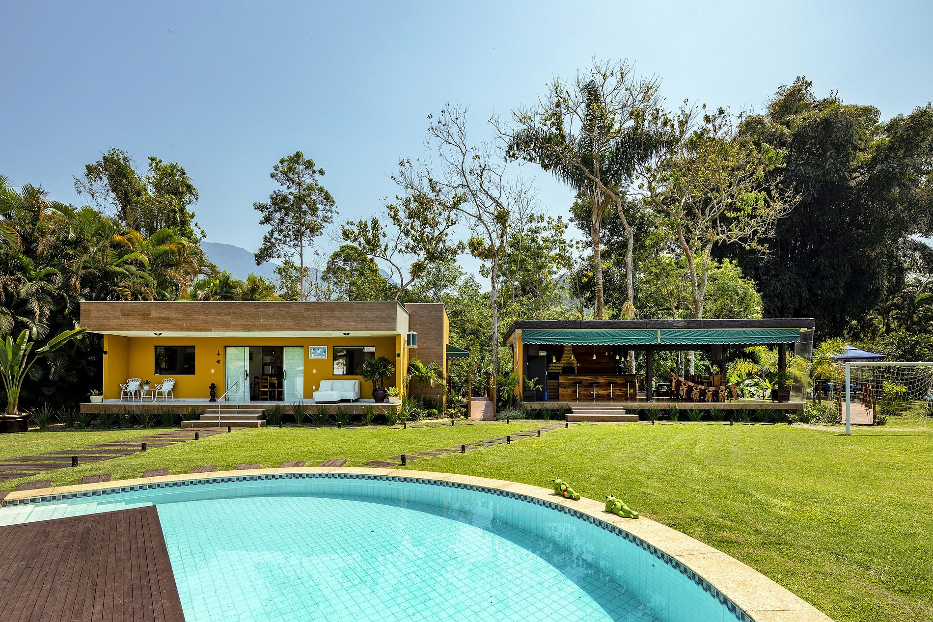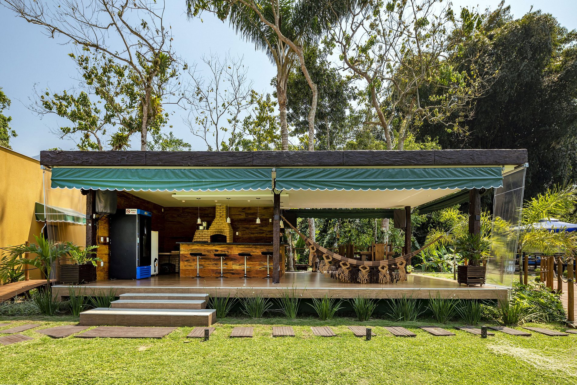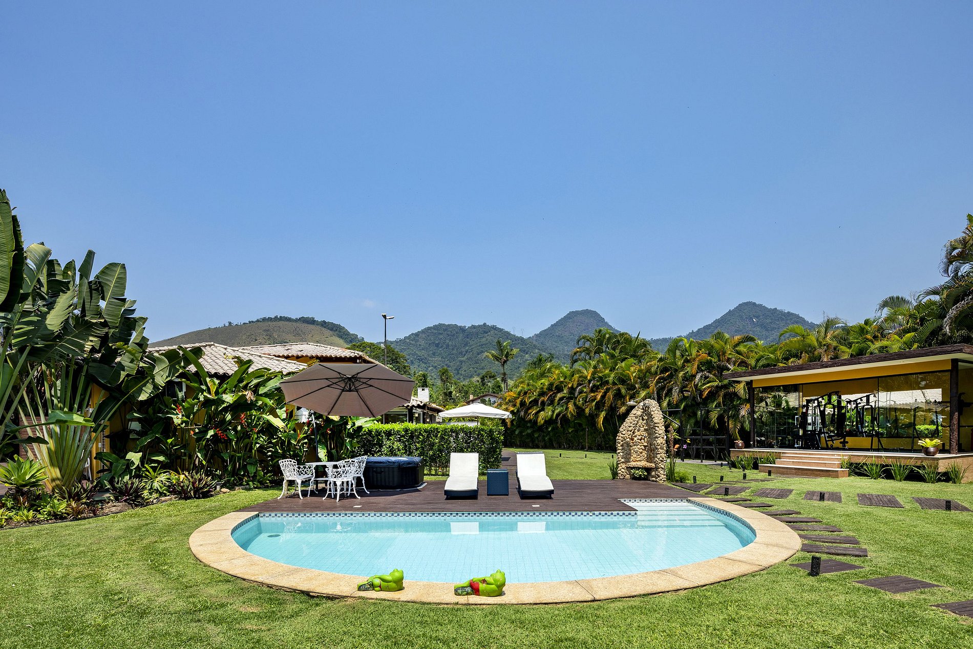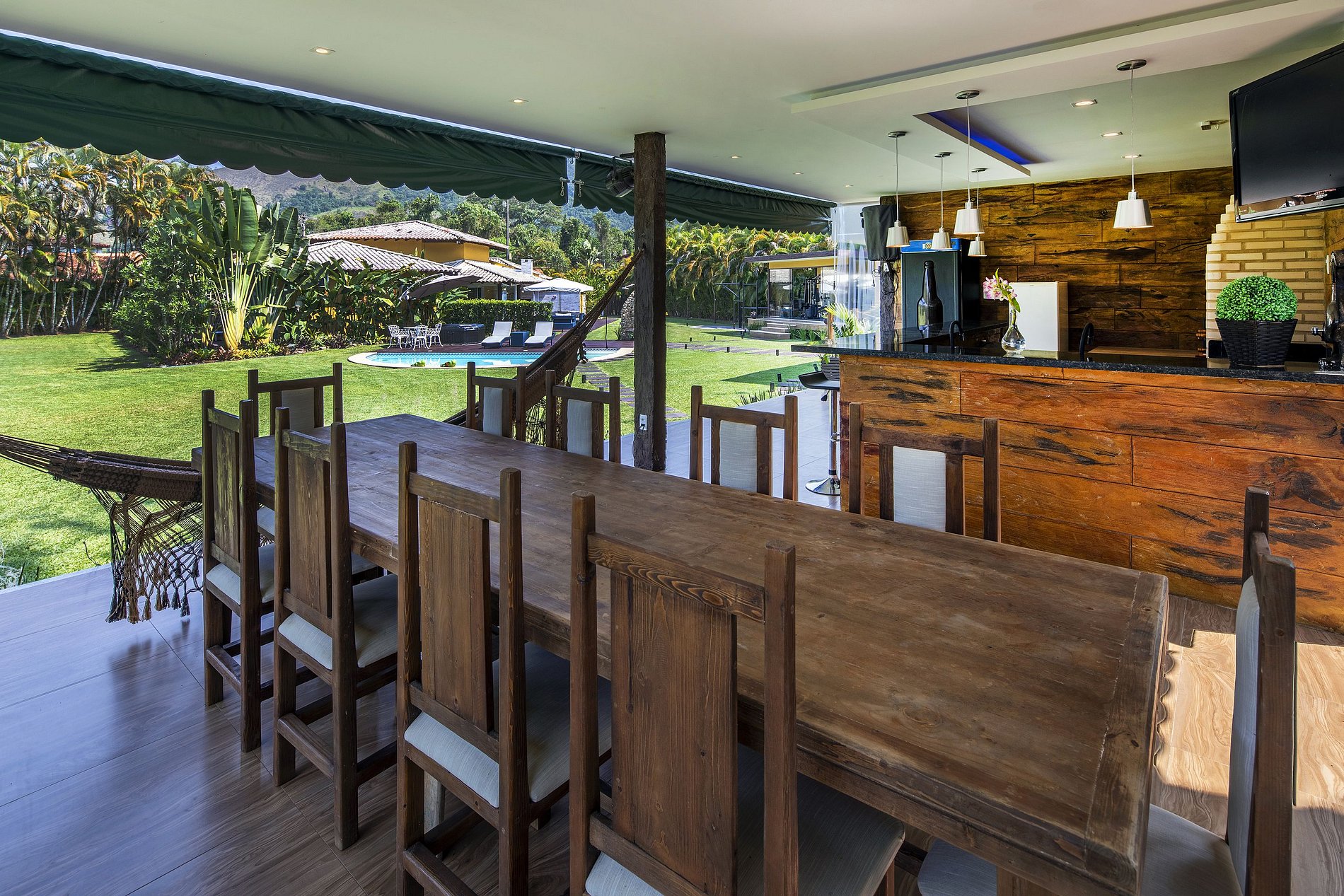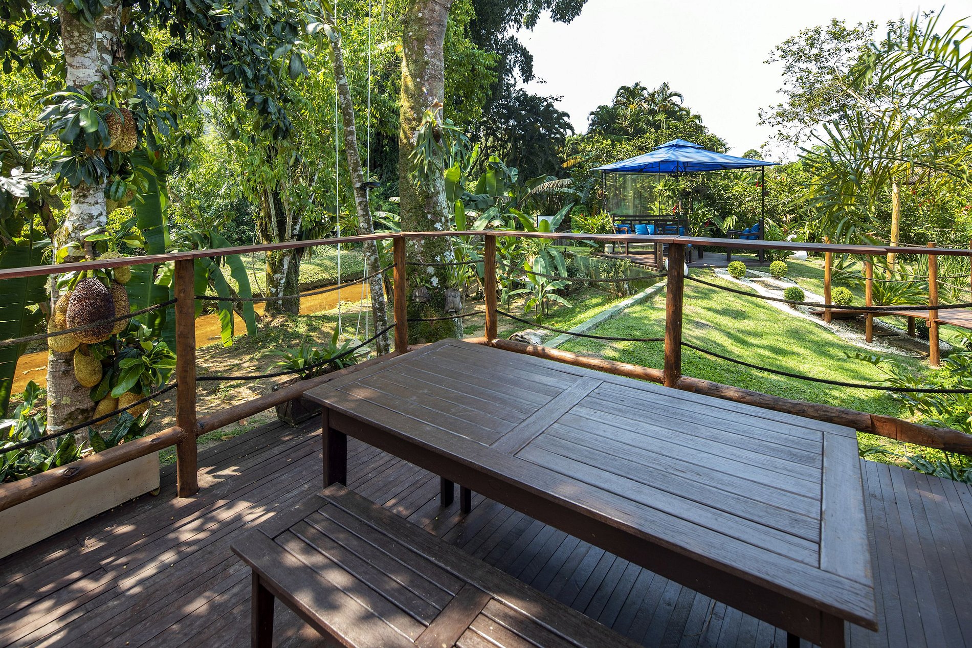 Due to the wonderful immersion in the Atlantic Forest, the property has a stream in the back and native trees around it. The entire length of the land is grassy and the external area has a gourmet space with a barbecue, wood stove, pizza oven, gas stove, table for up to 12 people, TV and a bathroom.