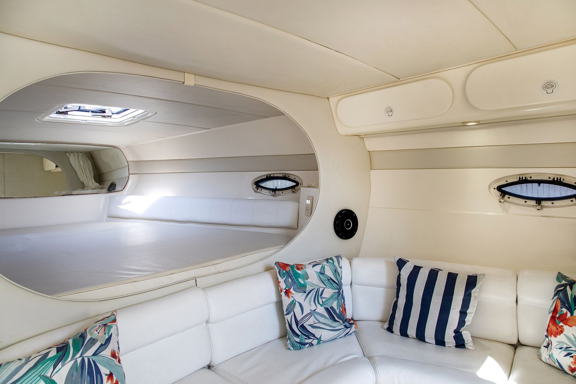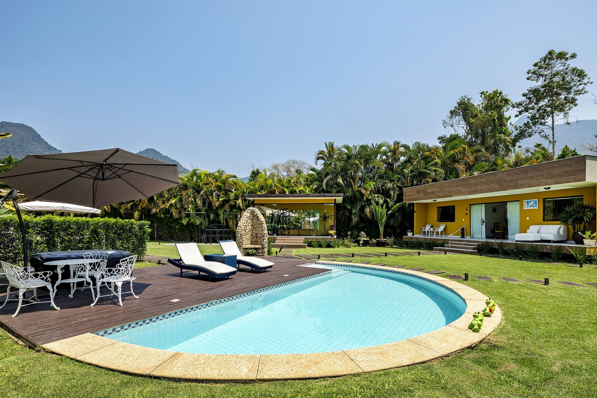 In the center of the outdoor area is the large semicircular pool with an attached wooden deck, with padded loungers and the outdoor hot tub.