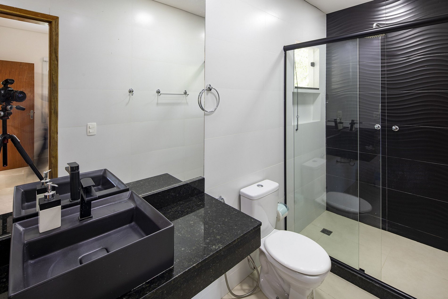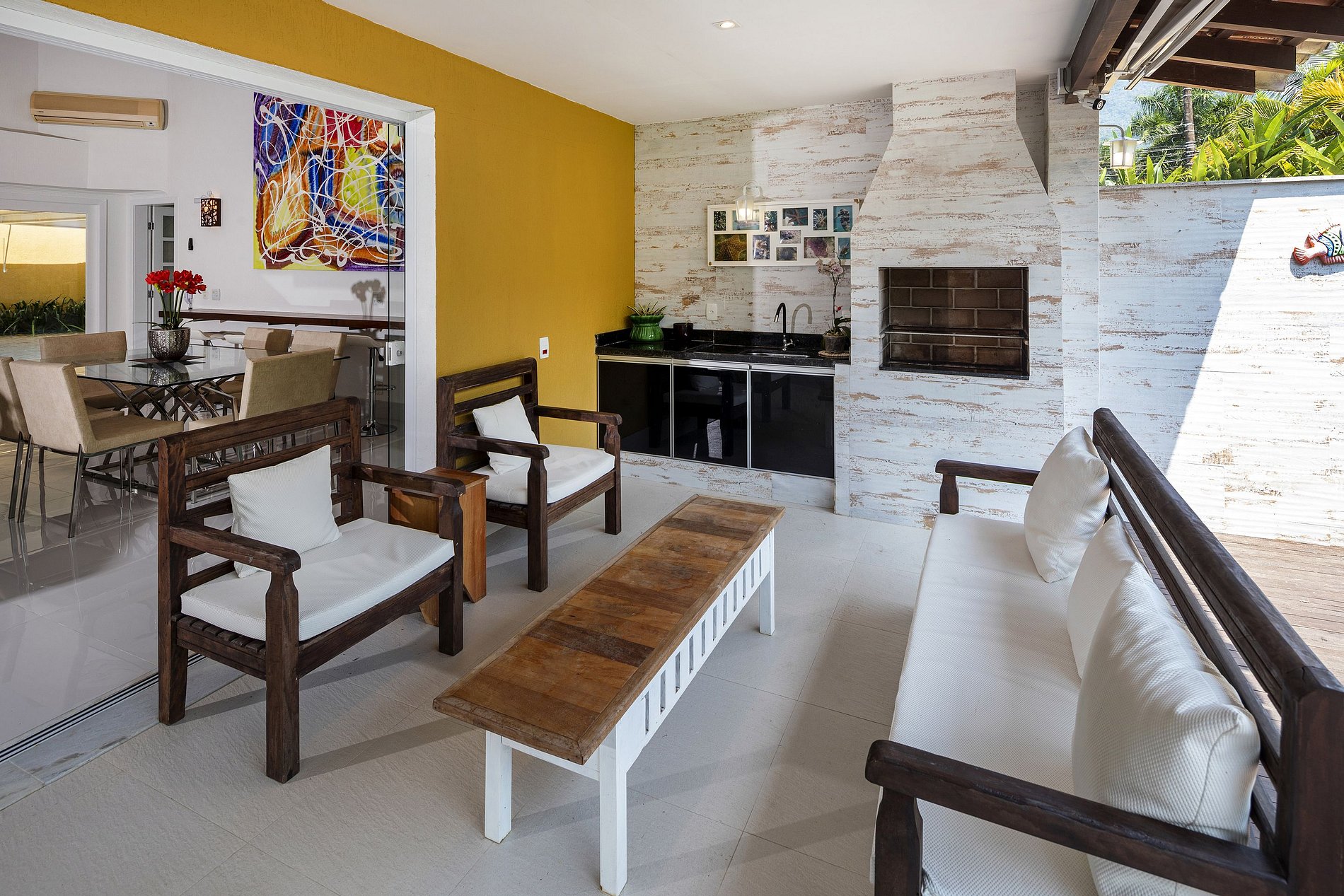 Main house with 2 suites, 2 bedrooms with 1 bathroom, toilet, full kitchen, living room with 75 inch TV, 4-meter sofa, dining table, bench with stools, wine cellar, balcony with barbecue, office room and bathroom for employees.