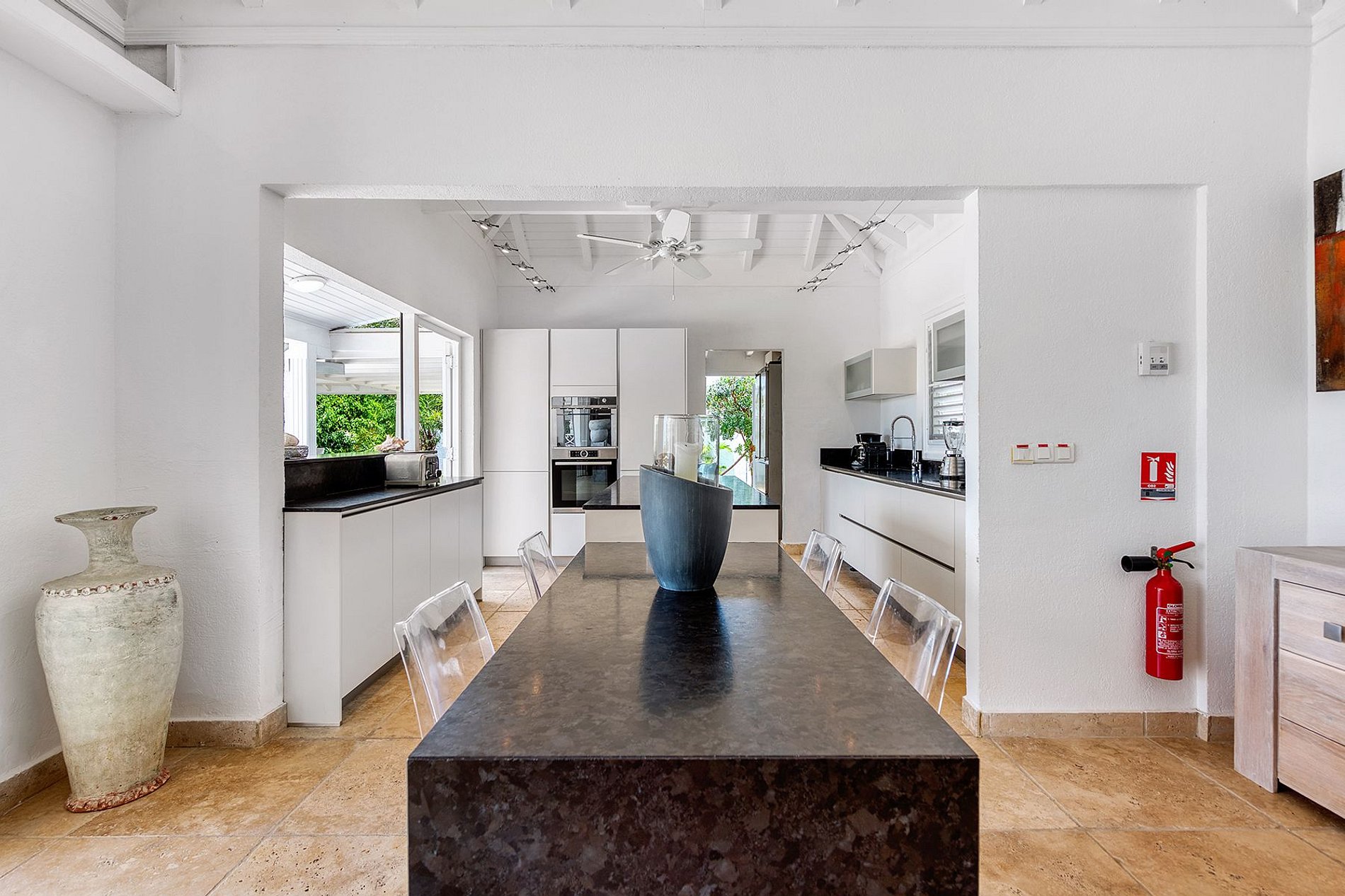 The main residence includes four spacious bedrooms, each with king-size beds and en-suite bathrooms, arranged to provide comfort and privacy. Its layout emphasizes seamless indoor-outdoor living, with open-plan living and dining areas extending onto a large covered terrace. A fully equipped kitchen connects directly to the outdoor spaces, creating an effortless flow for entertaining and daily living.