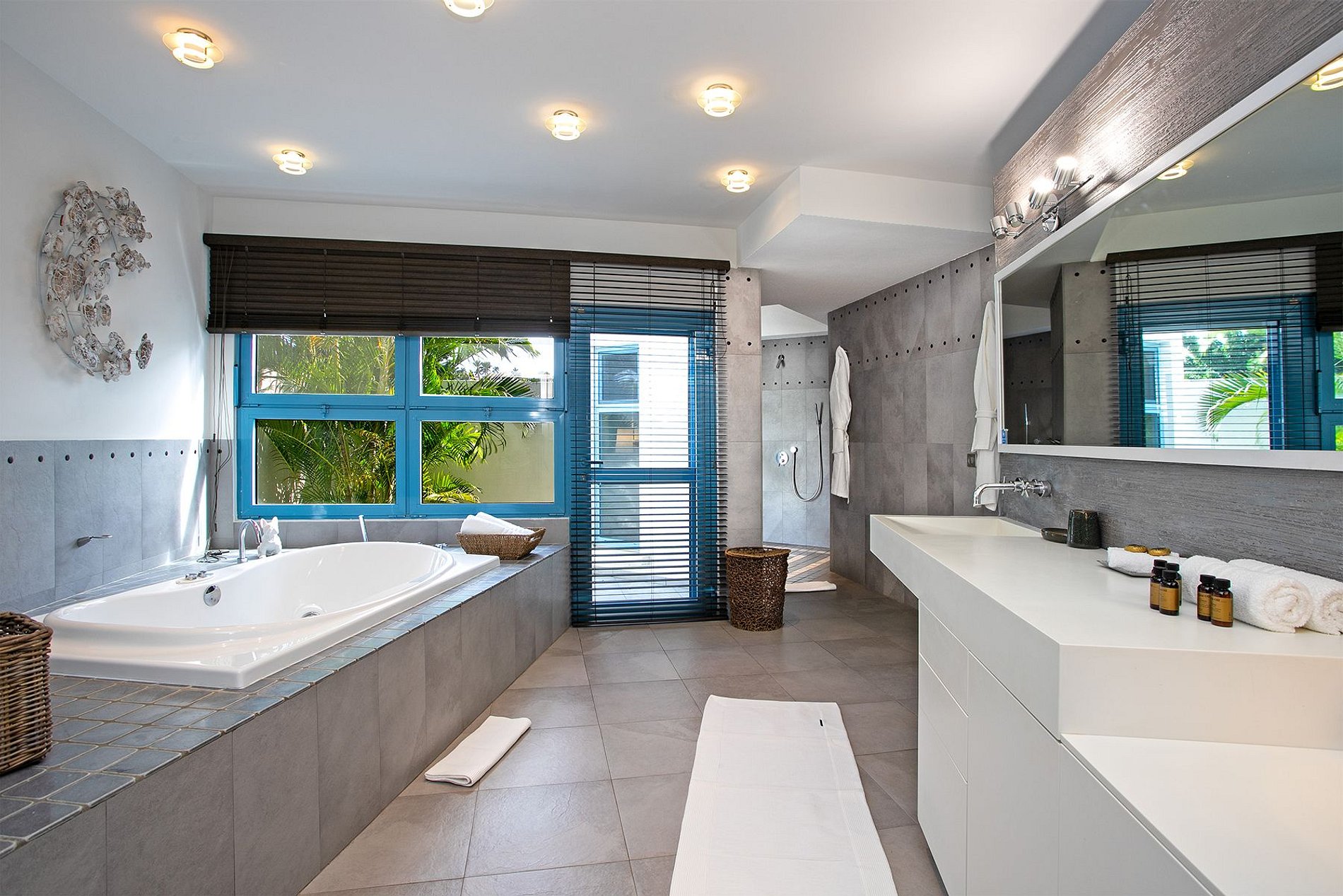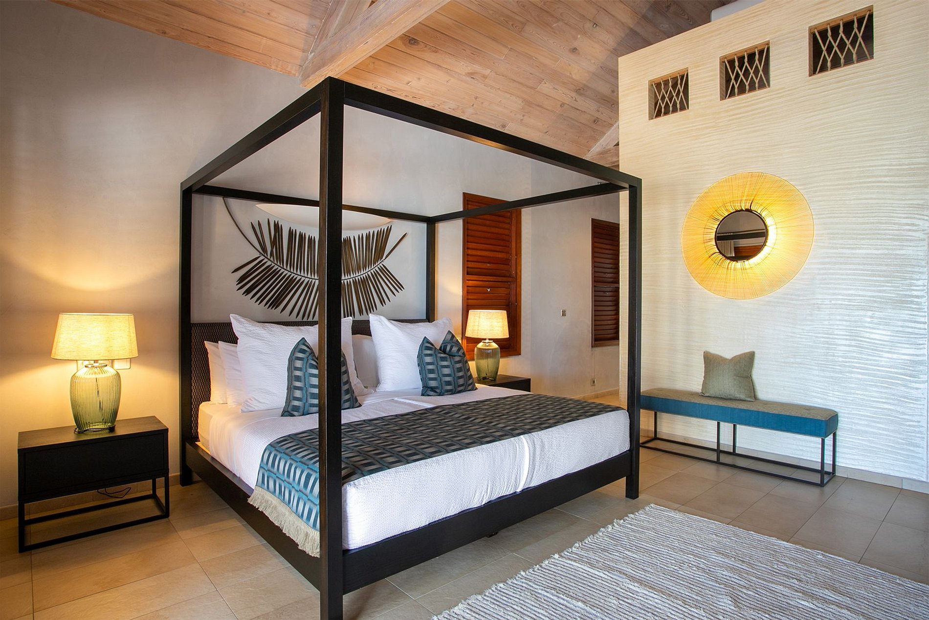 Within the landscaped grounds, shaded pathways lead through tropical vegetation to quiet seating areas, and a private gate opens just moments from the entrance to Baie aux Prunes Beach. A private tennis court completes the experience, adding a rare recreational element to the property.
