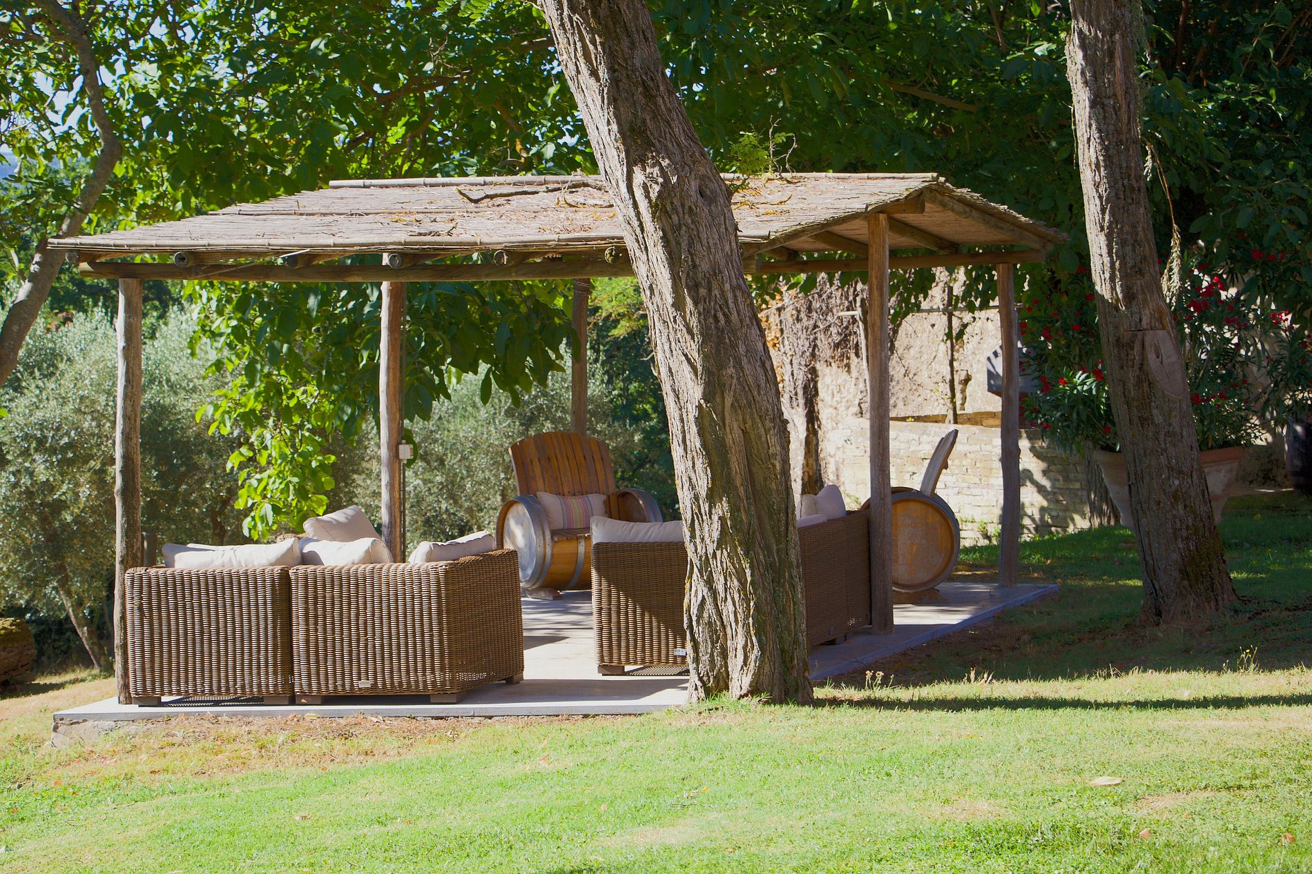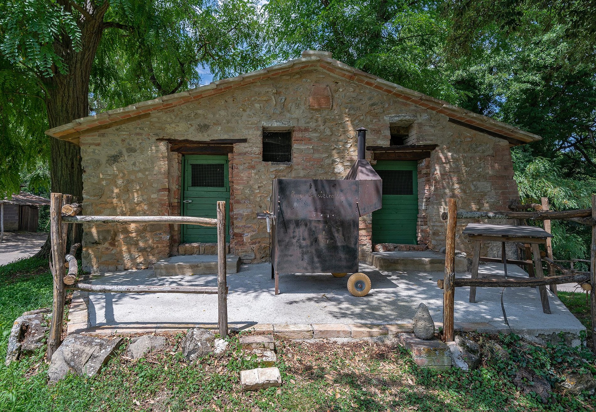 The Villa has been renovated in 2019, is divided into a north and a south wing and can host up to 20 people. The north wing has the main living room and dining room (90m2), a fully equipped modern kitchen on the ground floor: large picture window doors open onto the garden where guests can enjoy an evening cocktail or read a book while looking out to an incomparable glimpse of Montalcino. There are 4 bedrooms and 3 bathrooms on the first floor. A large covered patio, just next to the living room, and the kitchen is set up for dining along with a wood barbecue area.