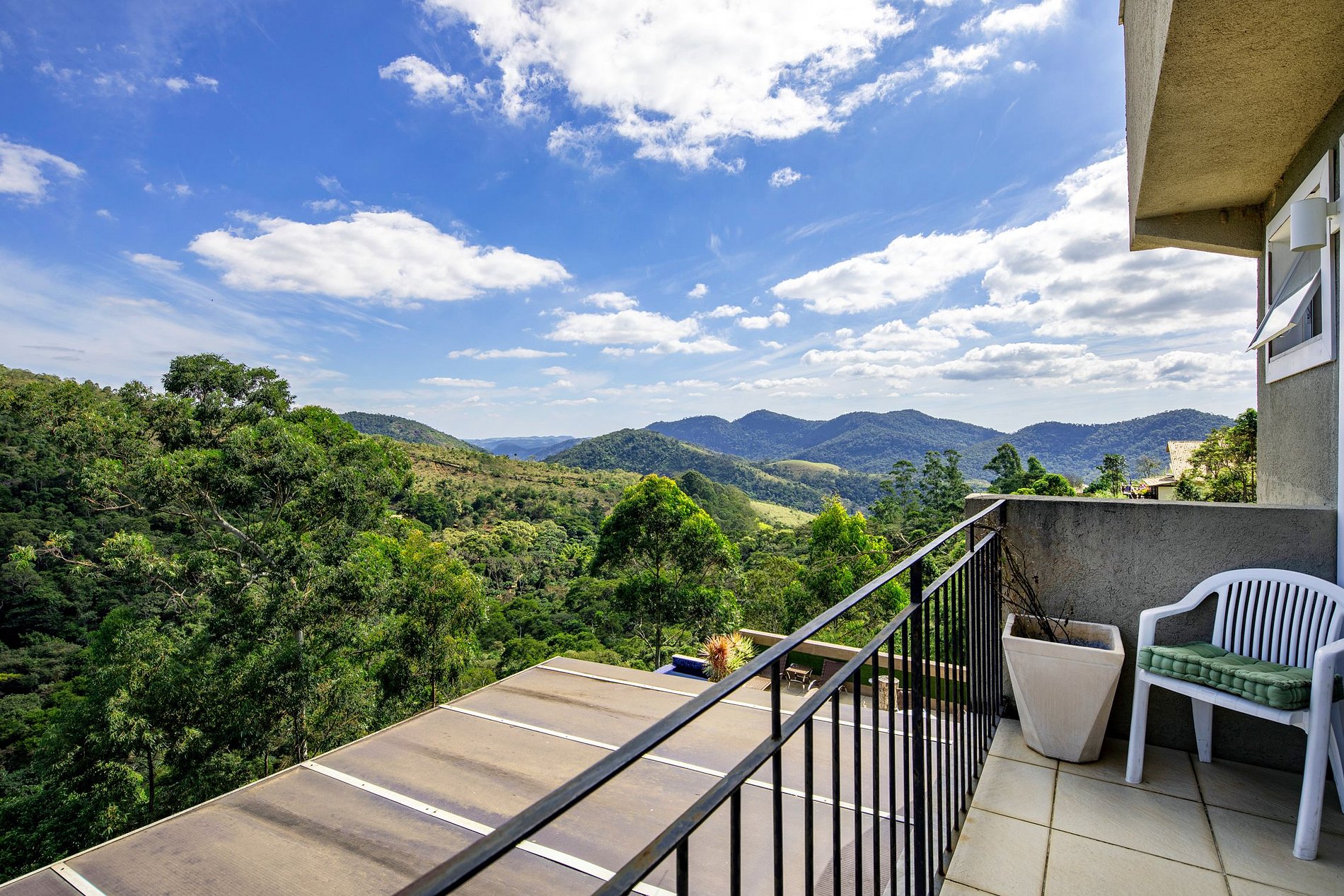 It has, among other amenities, Wifi, TV, air conditioning in the rooms, a jacuzzi, equipped kitchen, a large and very cozy living room, and five parking spaces. A really nice outside area with chairs, swimming pool, pizza oven, BBQ, and a breathtaking view of the forest and nature, where you can relax while enjoying the wonderful view of the mountains. The condominium offers tennis court, football court and security and monitoring 24 hours. Perfect place to enjoy days of rest and tranquility with family or friends in Serra Fluminense.