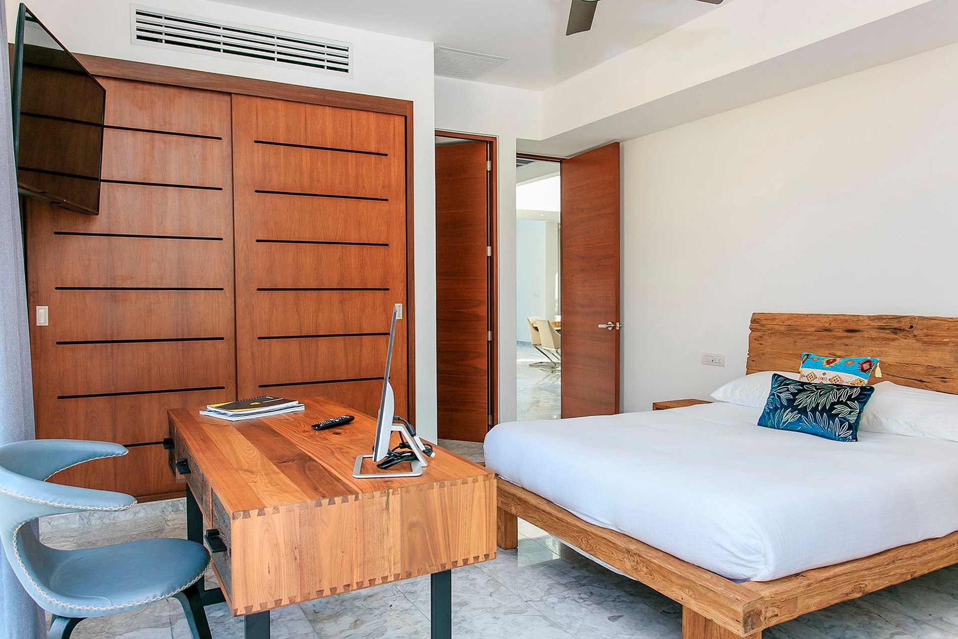 Relish the indoors with modern comforts including air conditioning and contemporary designer furnishings. The sleek kitchen is a haven for culinary inspiration. Source fresh seafood from local markets for a delightful barbecue night on the terrace, perfect for crafting mouthwatering tacos. Transform the formal dining area into an alfresco oasis for eight with swift door openings. Cap off the evening with terrace lounging and handcrafted cocktails while soaking in the captivating ocean vista.