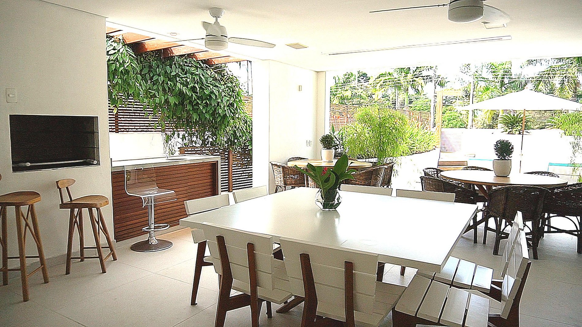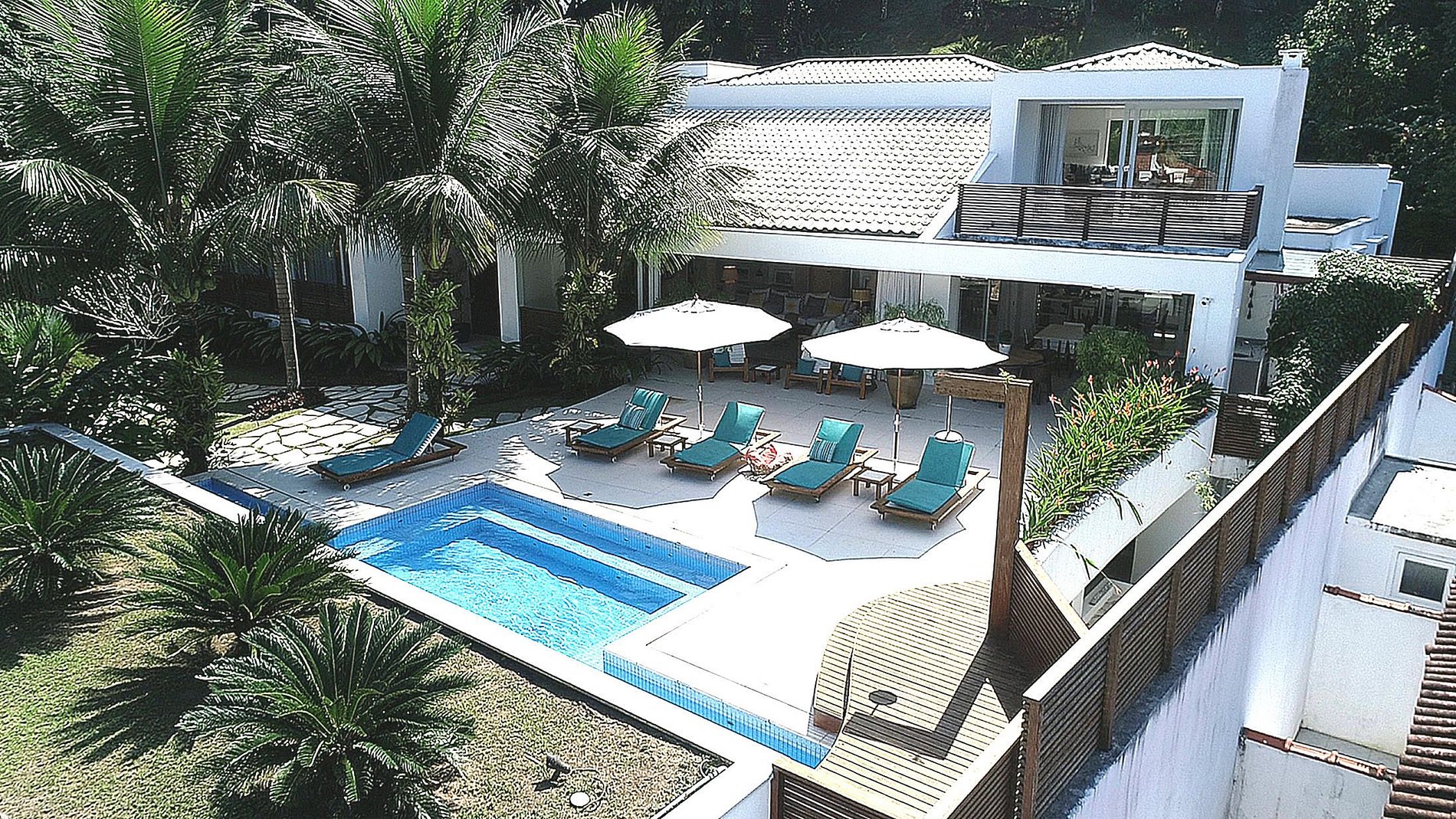 With 635m² of built area on a 2,000m² plot, the house consists of five rooms, five suites and two bathrooms. The rooms are large and well lit, with designer furniture and Brazilian decor that highlights local artists and artisans. The living room open to the terrace and pool is the ideal place to receive friends and family.