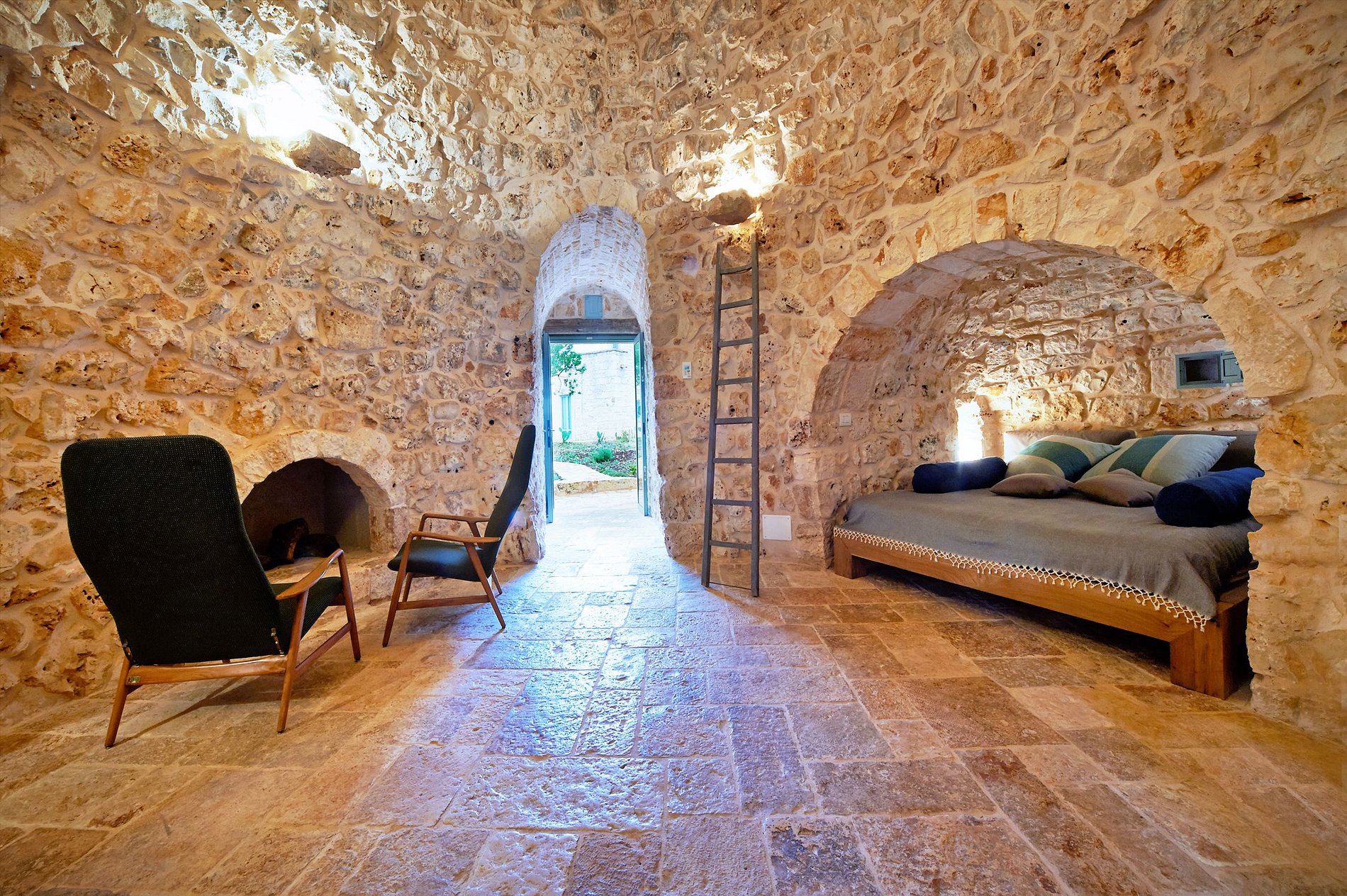 This collection is so blended with nature that it practically melts into the fertile landscape that surrounds it. The natural stones of the walkways, perimeter walls and building complex mix seamlessly into the rich green and earth tones of the surrounding landscape. The whitewashed slate roofs of the trulli, the green-blue frames of the doors and windows, and the dazzling pool in the heart of the complex add a dash of color and joy.