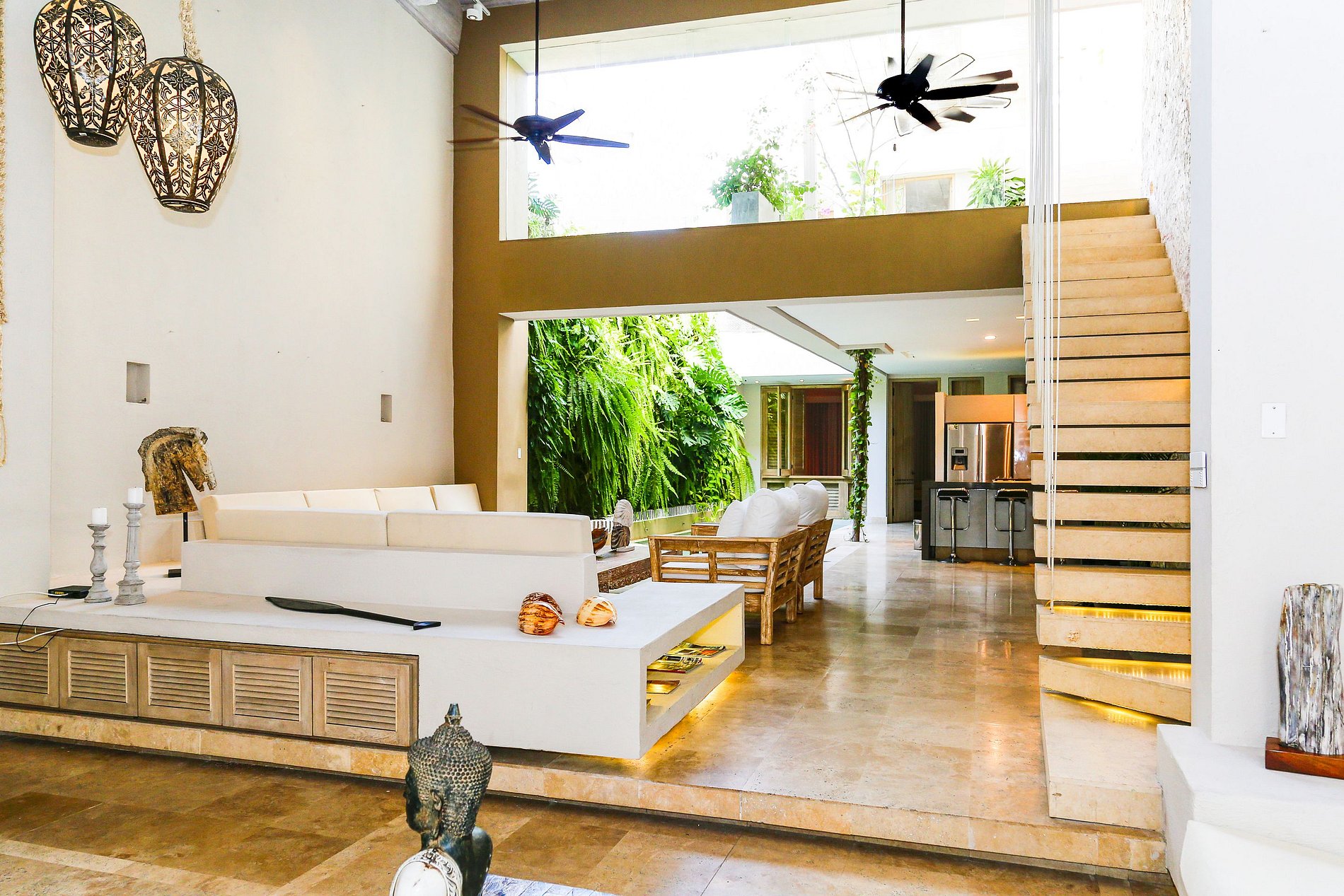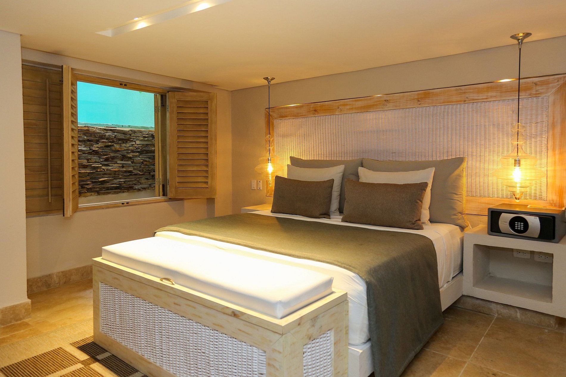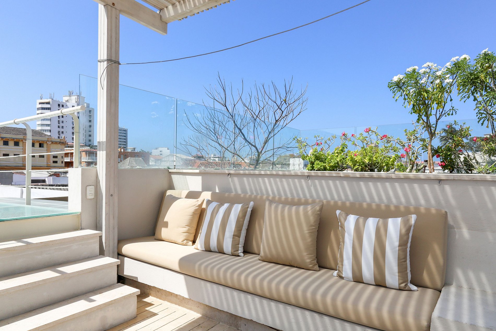 The second level of the house can be accessed by modern floating stairs in stone, followed by a beautiful path and flowerpots leading to the master suite equipped with a walking closet, television, balcony, and a magnificent view towards the interior of the house. On the third level is a spectacular viewpoint with a BBQ, jacuzzi, and view towards Cartagena's old city.