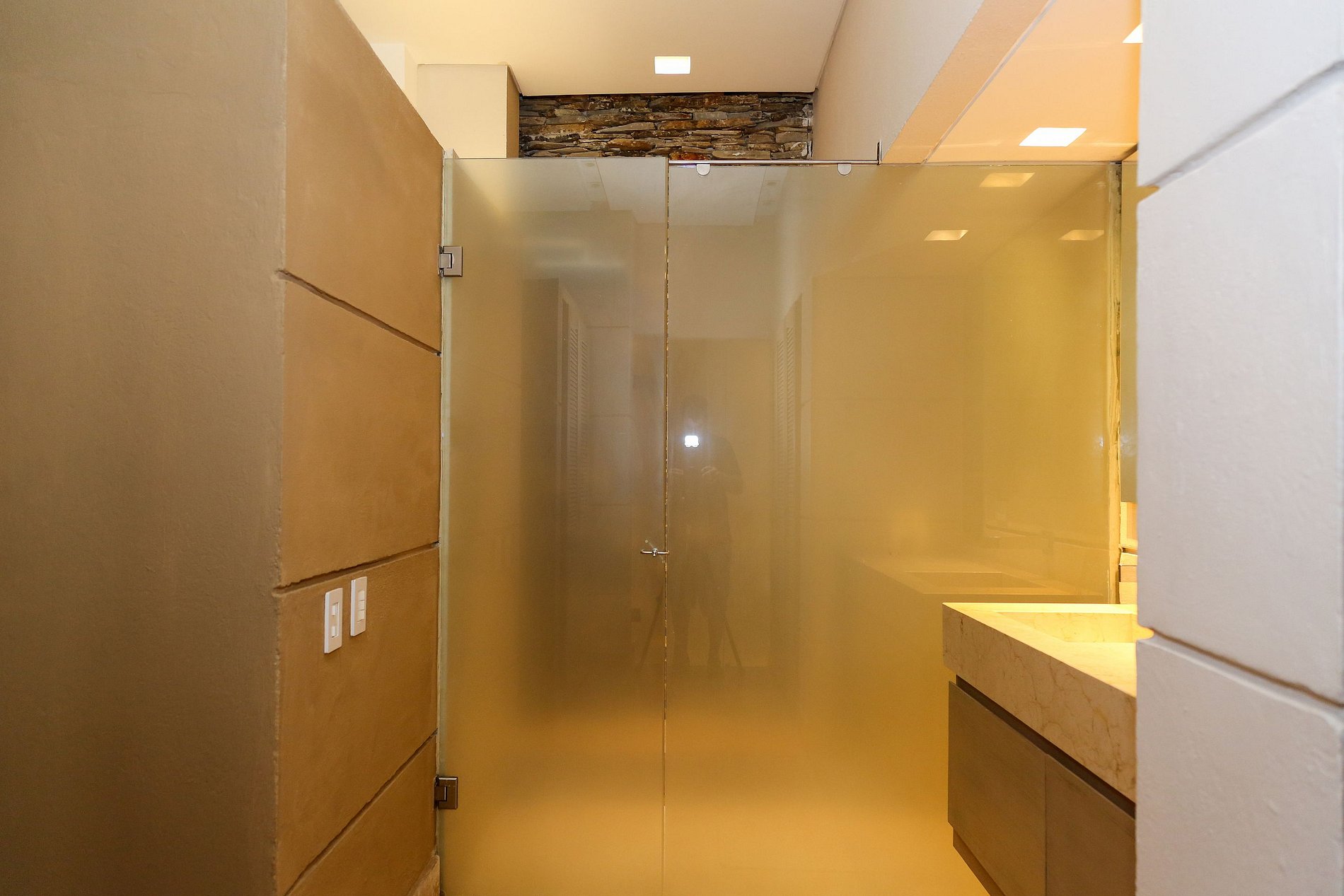 On the first level there is a first ensuite bedroom with a double bed, large closet, TV, and view towards the pool and the interior of the house. At this same level, you will find an open kitchen creating a space for easy interaction between guests. One level below, you will find a second ensuite bedroom overlooking the bottom of the pool.
