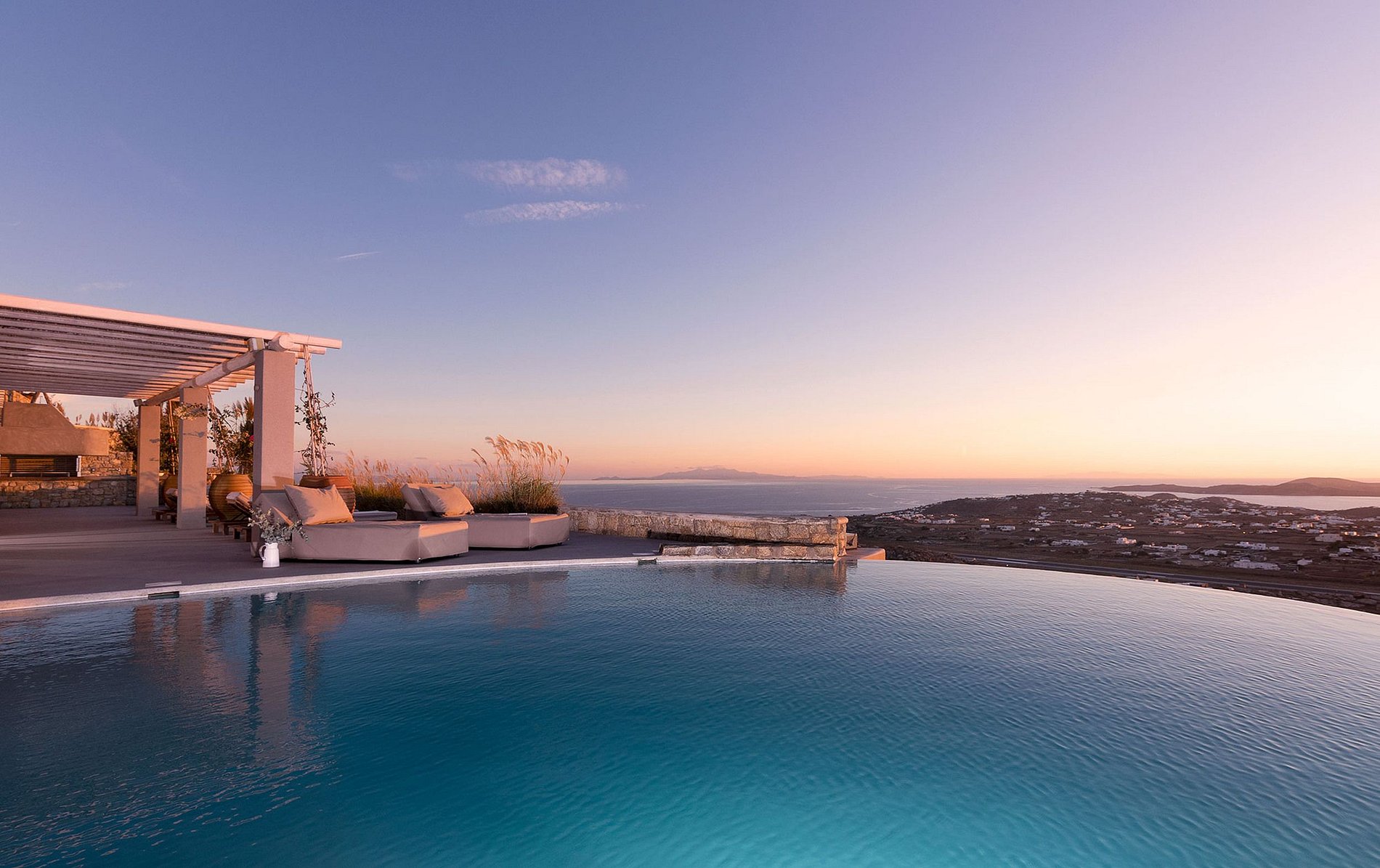 Newly built amazing villa for up to 12 guests, 280m2 in area, with minimal style decoration, designer furniture, luxury linen, and amenities. It is located at the hilltop of Kounoupas overlooking the Aegean Sea and Cyclades islands. Spacious outdoor area with sofa beds, sunbeds, three levels of patios with comfortable cushions, and a private pool with jacuzzi.