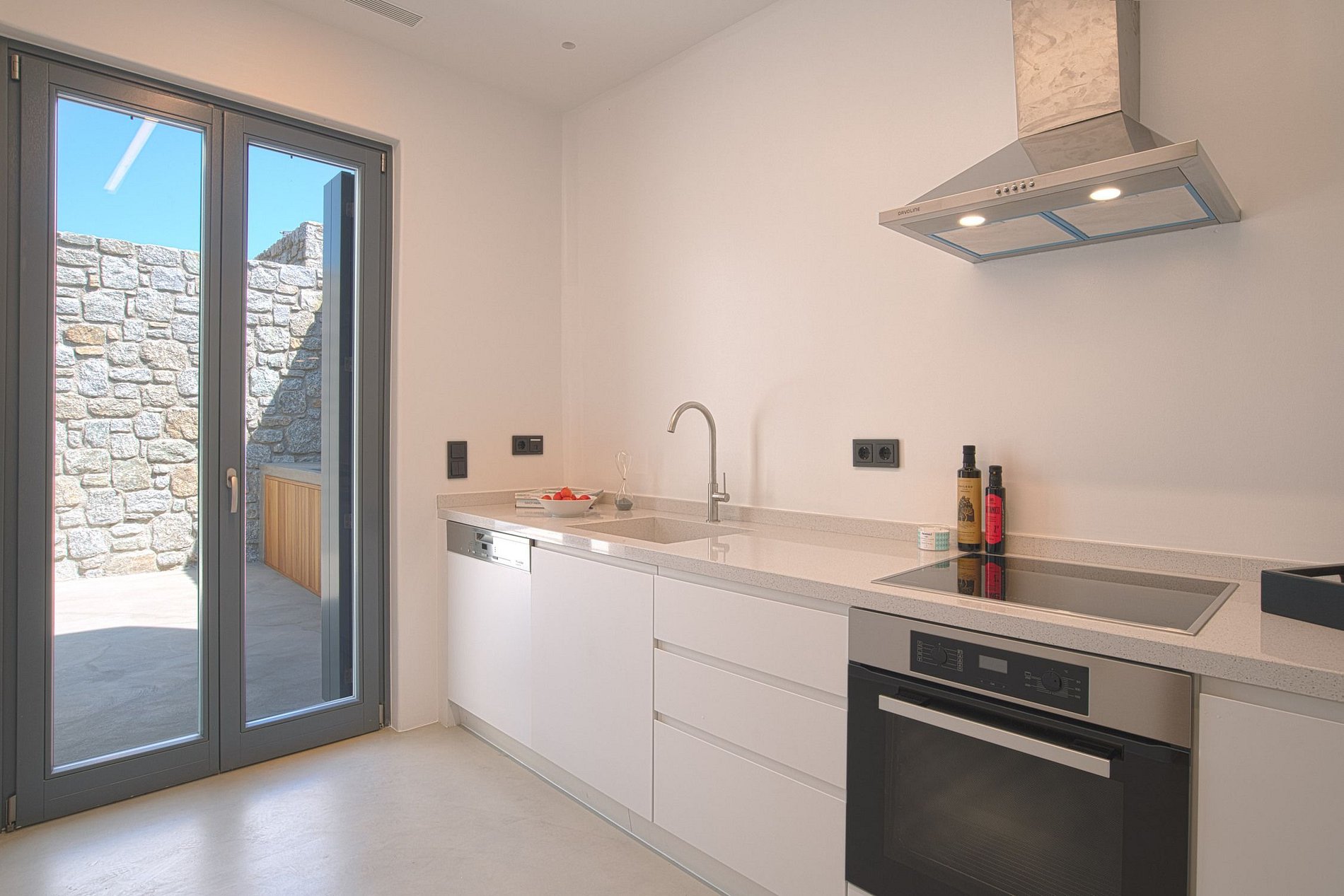 The villa features a brilliant white exterior partially covered in stone, a terrace with comfortable lounging and dining spots, an open-air kitchen, and a gorgeous infinity pool, all overlooking the sea with an amazing view that keeps changing as the day goes by.