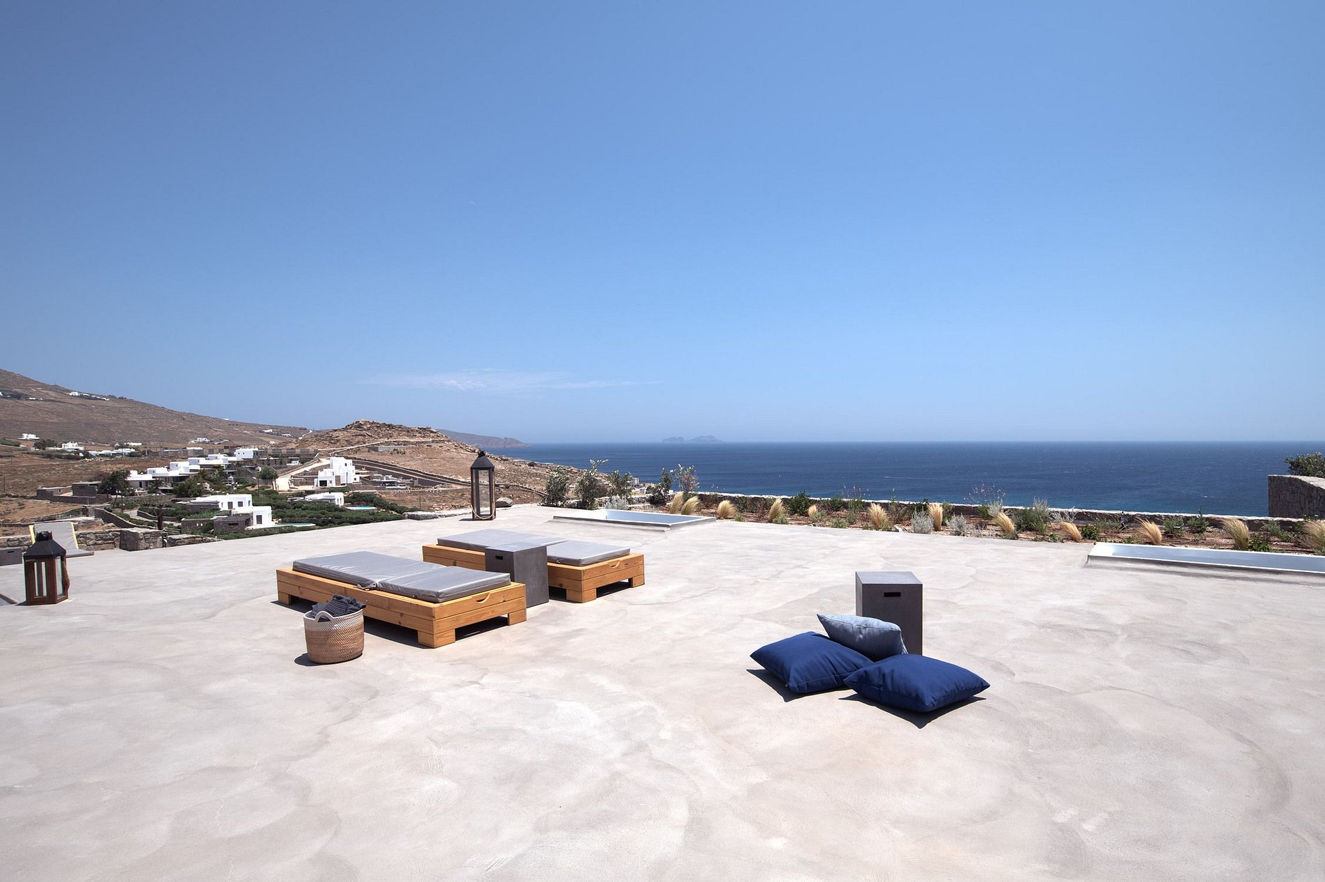 The ground level features a cozy living room, a fully equipped kitchen and a guest WC. A staircase leads to the four different sized bedrooms that occupy the lower level, all equipped with glass doors that open to the terrace and their own bathroom.