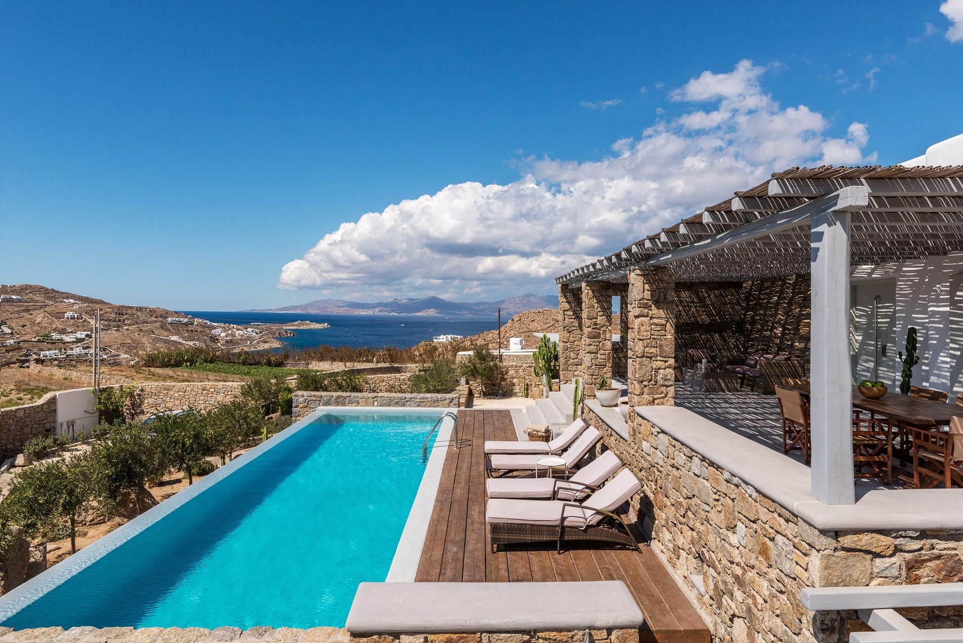 The modern decor blends with traditional architecture for a luxurious Greek holiday. Villa has four spacious bedrooms and can accommodate up to 8 people. The interior consists of a modern, fully equipped kitchen, spacious dining area and living room with windows and doors. The large covered outdoor terrace commands a spectacular view which you can enjoy seated in the comfortable outdoor living area.