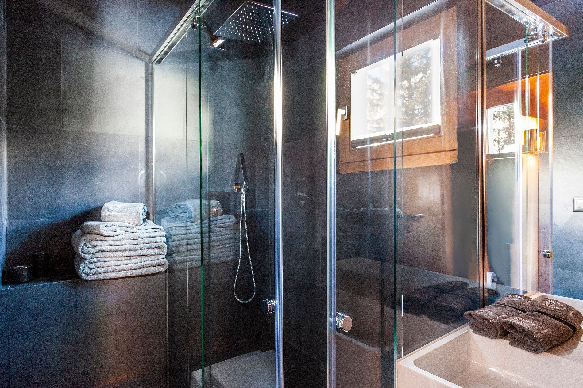 The luxurious, contemporary furnished 3-level chalet has a main house with 4 double bedrooms and 4 bathrooms and an additional apartment with 1 double bedroom, 1 living room and 1 bathroom. The two spaces can be connected to each other so it becomes one big property and can host up to 12 persons.